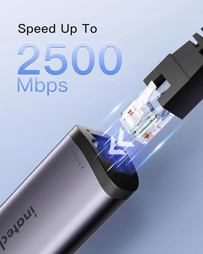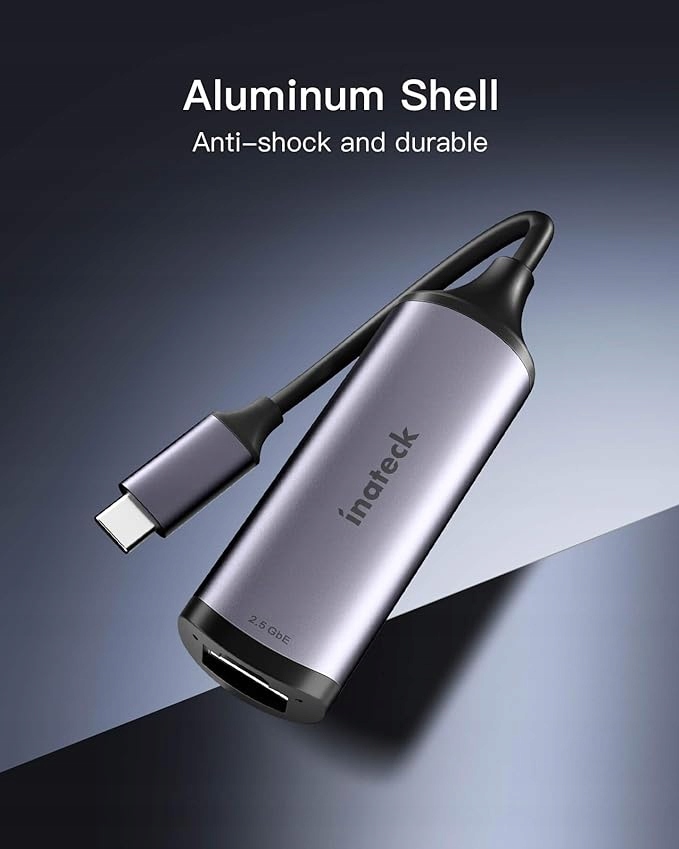 - Адаптер Ethernet USB Type-C – 2500 Мбіт/с: Inateck ET1001 дозволяє підключати порт USB Type-C до бездротової мережі 2500 Мбіт/с, забезпечуючи вашому комп’ютеру швидкість передачі 2,5x 1000 Мбіт/с.