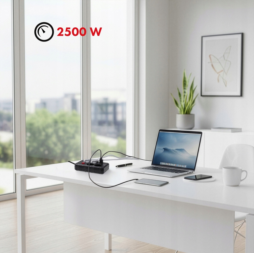 ✔️ Планка дозволяє підключати пристрої із загальною потужністю до 2500 Вт, а це означає, що вона легко живить комп'ютер, монітор, принтер, телевізор, зарядні пристрої чи настільні лампи.