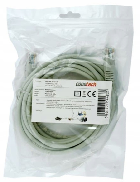 Кабель Patch Cord U/UTP cat.6, також званий патч-кабелем, це кабель, призначений для передачі електричних або оптичних сигналів. Його найпопулярнішим типом є так звана «вита пара», закінчена клемами RJ45 з обох сторін. Патч-кабель LAN U/UTP cat.6 складається з чотирьох пар асиметрично скручених ліній CCA, відокремлених одна від одної поперечним роздільником. Для виготовлення покриття було використано сірий ПВХ ПВХ, який захищає від механічних пошкоджень і забезпечує швидку та довговічну прокладку кабелю. Кабельні з’єднувачі у вигляді заглушок наповнені пластиком для збільшення жорсткості та продовження терміну служби.