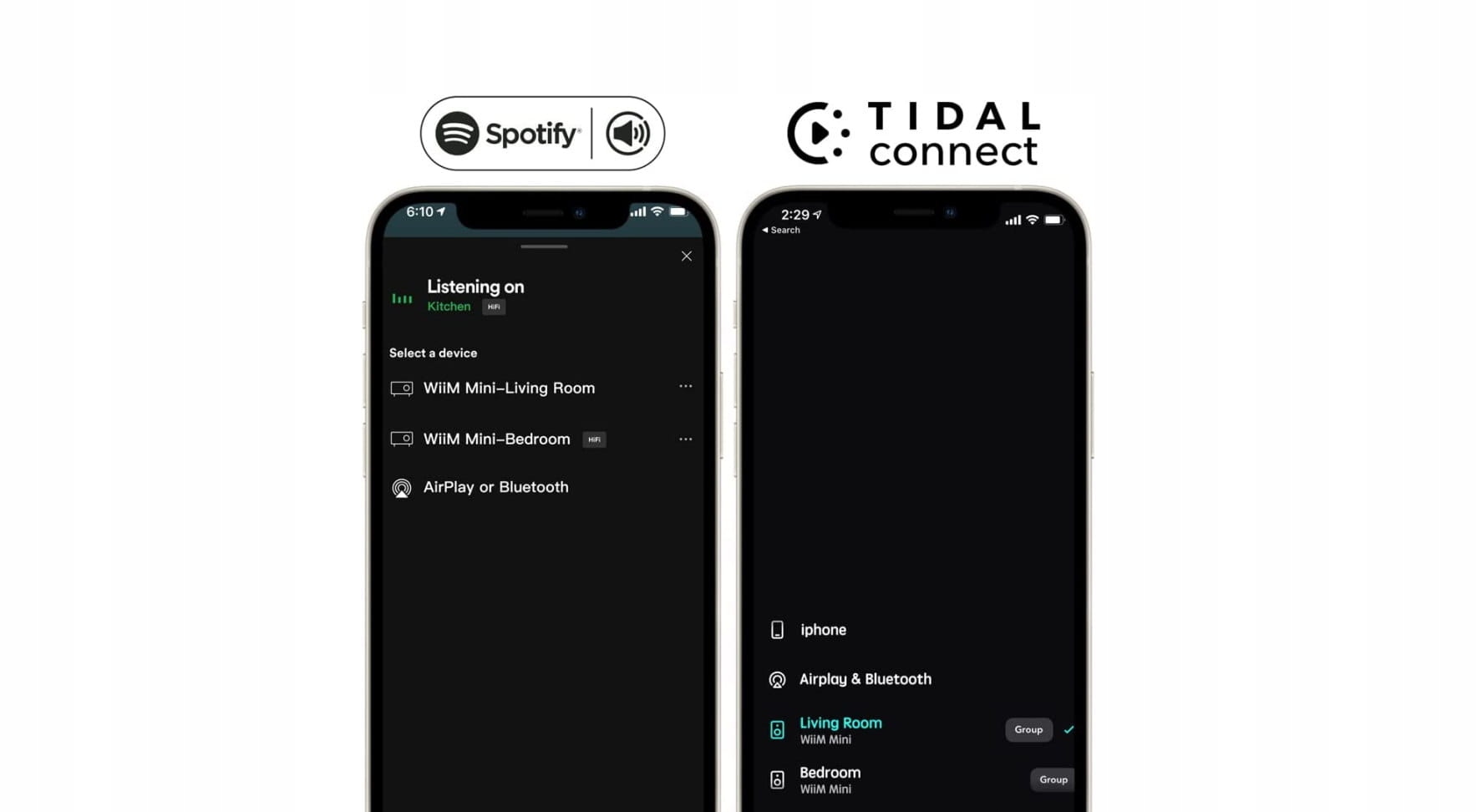 Використовуйте програму Spotify або TIDAL як пульт дистанційного керування для свого WiiM Mini та транслюйте потокове передавання безпосередньо з цих служб. WiiM Mini забезпечує вищу якість звуку та більший робочий діапазон, ніж традиційні приймачі Bluetooth або AirPlay 2, і звільняє ваш мобільний пристрій для інших завдань. Spotify працює як для користувачів Spotify Free, так і для користувачів преміум-класу. TIDAL працює як для HiFi, так і для Master Quality (без MQA).