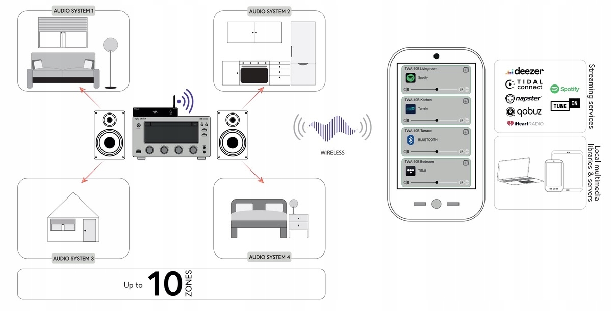 TWA-10B дозволяє передавати цифровий музичний вміст зі смартфонів, планшетів, музичних бібліотек на комп’ютерах або мережевих сховищах, а також із найкращих музичних онлайн-сервісів і радіостанцій.