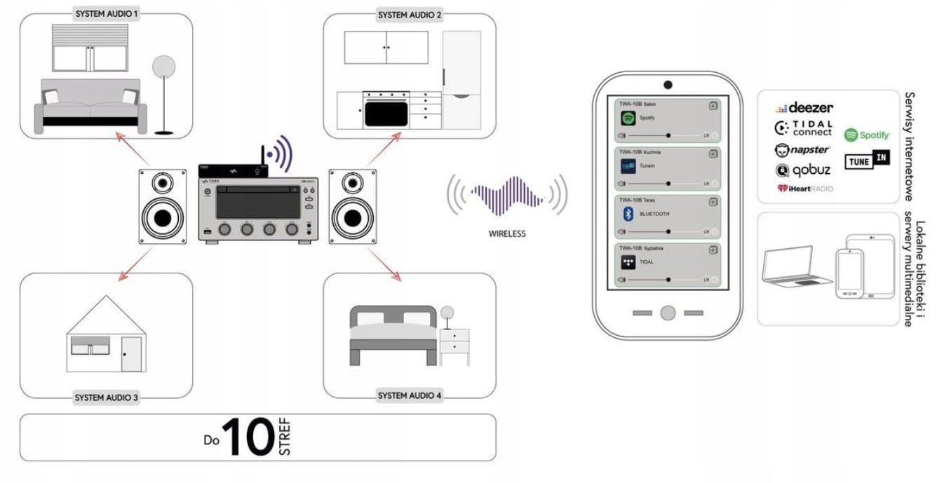 TWA-10B дозволяє транслювати цифровий музичний вміст зі смартфонів, планшетів, музичних бібліотек на комп’ютерах або мережевих сховищах, а також із найкращих музичних Інтернет-сервісів і радіостанцій.