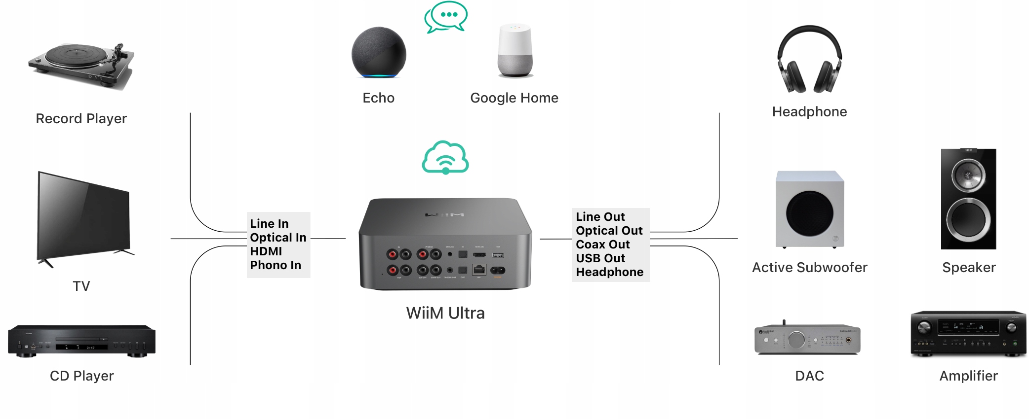 Як і в попередніх продуктах, WiiM легко підключається до широкого кола пристроїв завдяки спеціальному фоно входу із заземленням, входу HDMI ARC і 3,5 мм навушникам Гніздо, встановлене спереду, оптичний вхід/вихід, аналоговий лінійний вхід/вихід, коаксіальний вихід для сабвуфера та USB-Aдля відтворення медіа. Також є порт Ethernet і тригер 12 В для підключеного підсилювача.
