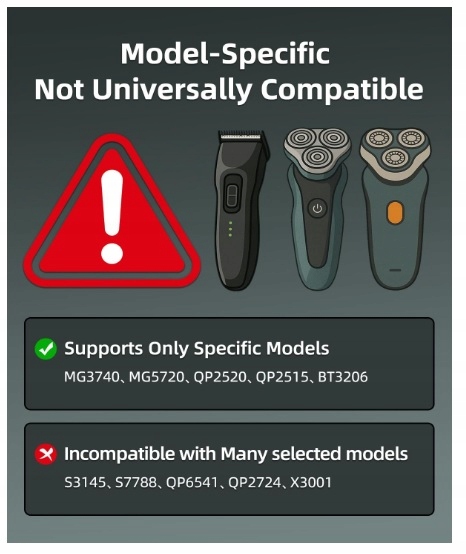 - Уважно перевірте, чи роз’єм бритви та кабель сумісні. Несумісний із One Blade 360 / Pro 360, QP2834 QP2824 MG5910 MG7910 MG9510, HQ8505, HQ850, HQ840.