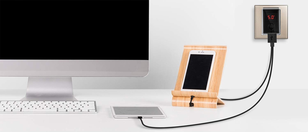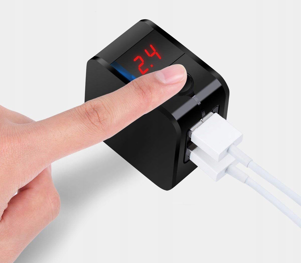 Мережевий зарядний пристрій, оснащений 2 USB-портами та вимірювачем напруги/струму заряджання.