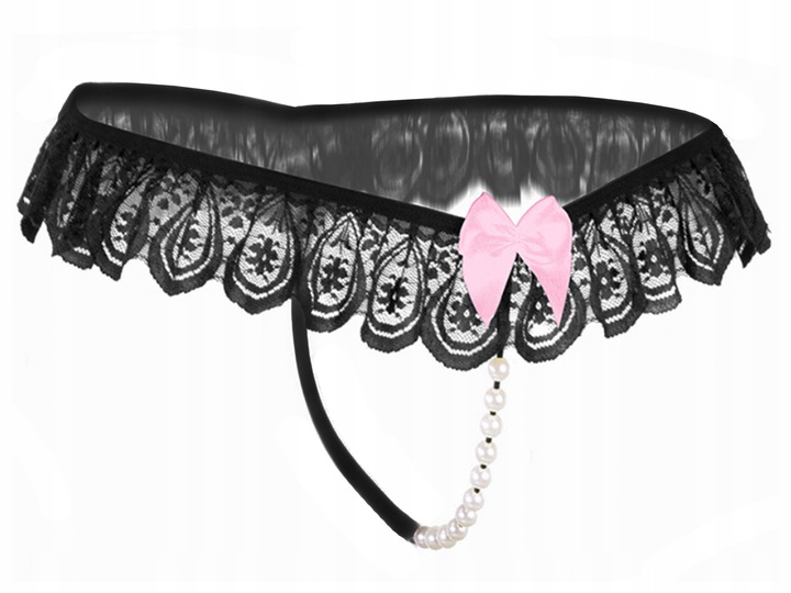 Чудове мереживне жіноча білизна. Чорні стрінги з перлами і рожевим бантом. Прозора жіноча білизна. Він ідеально лягає на жіноче тіло, демонструючи всі його переваги. Жіноча білизна, яка надає жіночому тілу сексуальності. Еротична білизна. Це ідеальний подарунок.
