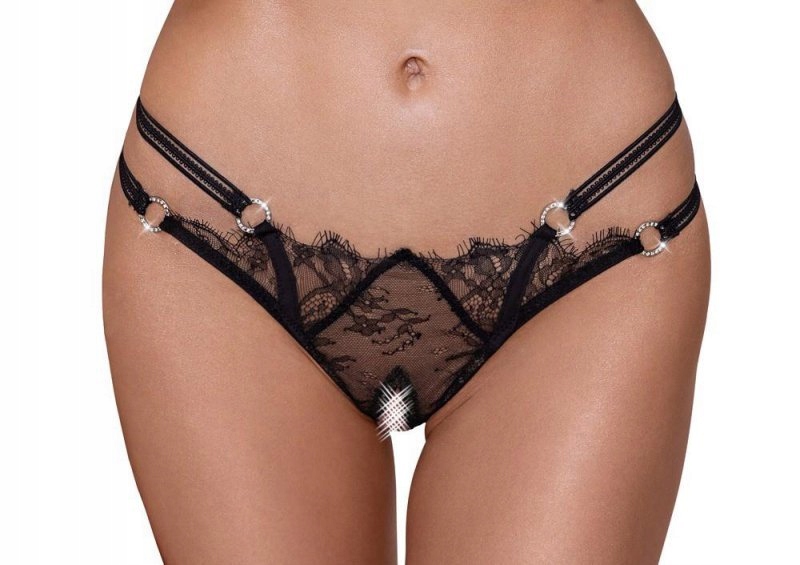 Стінги Rio від Cottelli LINGERIE з ніжного, частково підкладеного мережива, прикріпленого до вій. Витончений подвійний еластичний пояс із 4 кільцями з опаловими стразами. Еластична вставка ззаду забезпечує ідеальну зручну посадку. Відкрити в кроці.