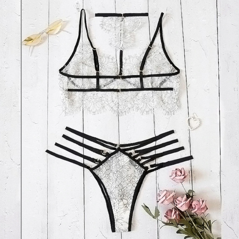 Комплект виконано з ніжного мережива чорно-білого кольору.