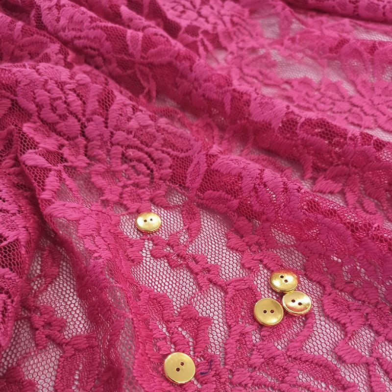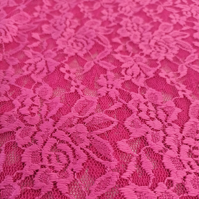 Рожеве мереживо з красивим квітковим візерунком. Приємна на дотик, еластична, м'яка на дотик.