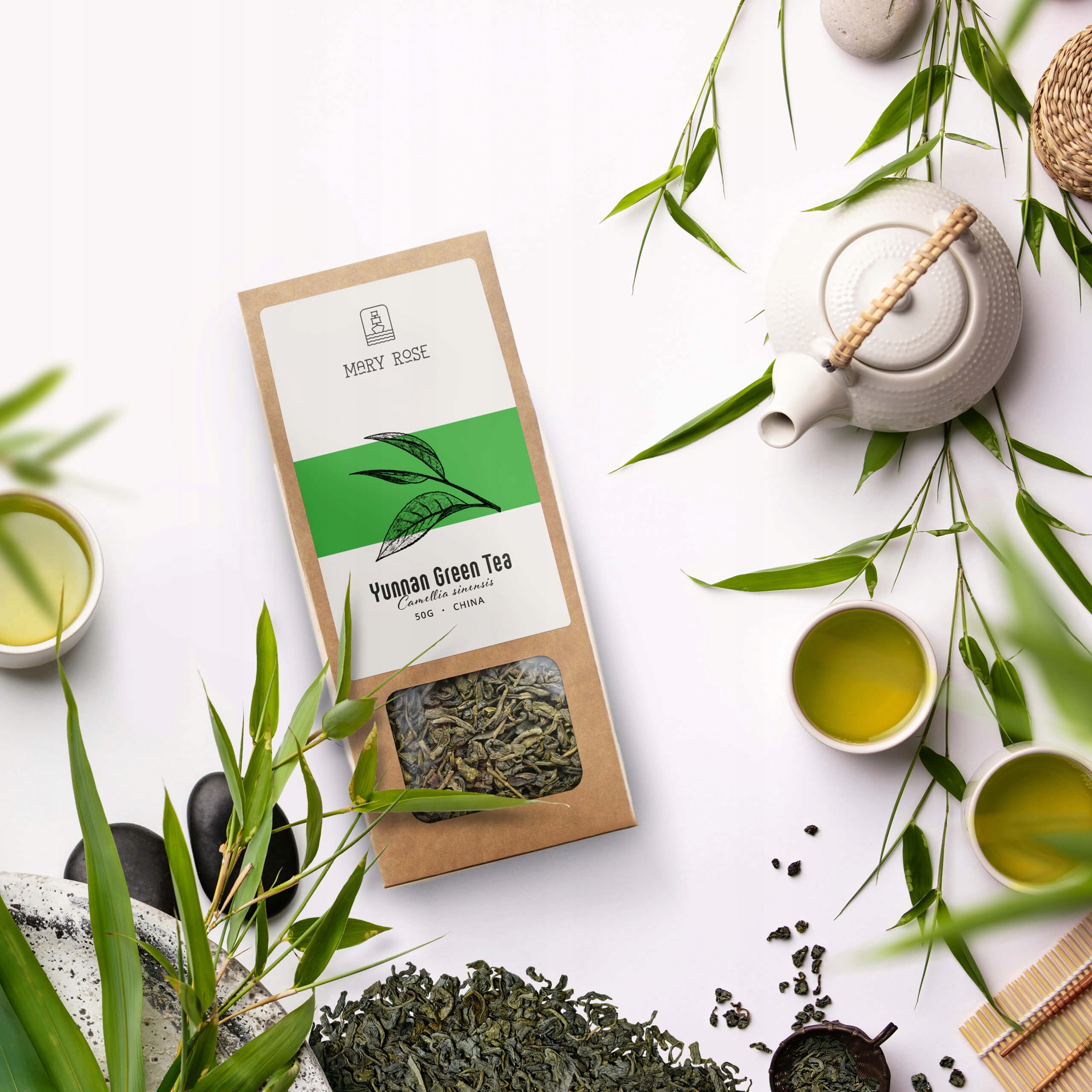 Зелений чай Мері Роуз Юньнан походить з Китаю, з однойменної провінції. Він має характерні, прокатані середньо -розміщені листя, які розвиваються після затоплення теплою водою. Інфузія, виготовлена з нього, має приємний, мідний колір, виразний аромат та інтенсивний смак, саме тому він часто поєднується з різними доповненнями. Додаткова інформація: