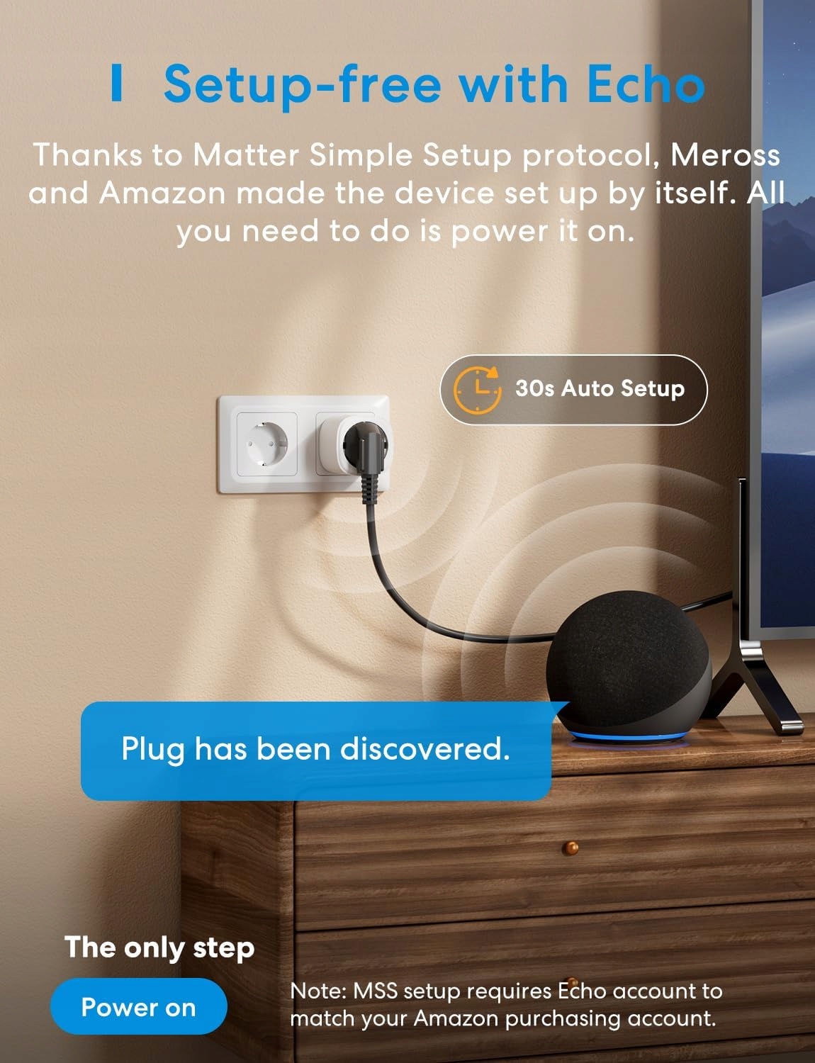 - Матеріальна проста установка (MSS): закінчуйте складним процесом з'єднання! Просто підключіть вилку до джерела живлення і скажіть своєму Amazon Echo відкрити пристрій. Alexa сканує пристрій і автоматично закінчить з'єднання. (Порада: MSS можна використовувати лише в тому випадку, якщо ваш рахунок покупки відповідає рахунку Echo. В іншому випадку він може бути підключений до килима традиційним способом).