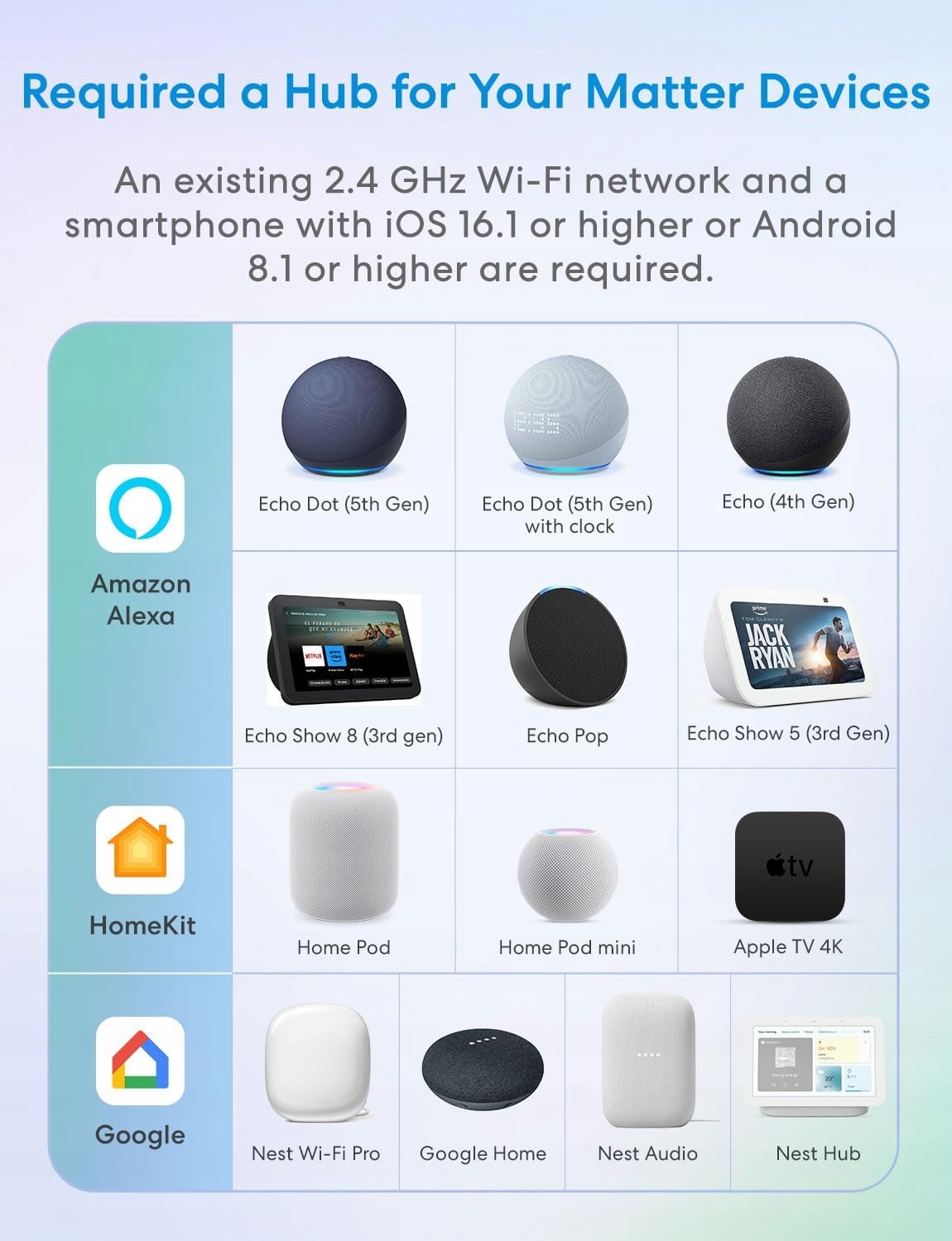 - Вимоги для користувачів Apple: iOS, iPados 16.1 (або новіші), 2,4 ГГц та центр для вибраної платформи, наприклад, Apple TV 4K (2 або 3 -е покоління) або HomePod Mini. Android 8.1 або новіший, 2,4 ГГц та центр для вибраної платформи, такі як Samsung Smartthings Hub V3, Amazon Echo (4 -е покоління), Google Nest Hub (2 -е покоління), Nest Hub Max або Nest Wifi Pro. Патентний номер: 009198401-0001.