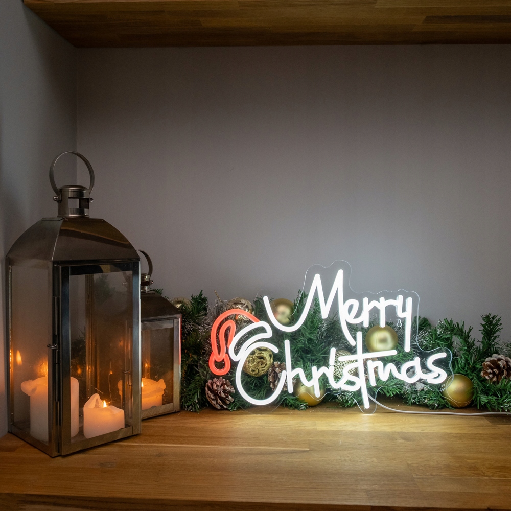 Принесіть чарівне різдвяне сяйво у свій дім за допомогою цієї чарівної неонової вивіски Merry Christmas від TRIXES!. Класичний напис «Merry Christmas» у яскравих, веселих кольорах, прикрашений кумедним капелюхом Санти, створює веселий акцент, який ідеально вписується як у традиційний, так і в сучасний інтер’єр.
