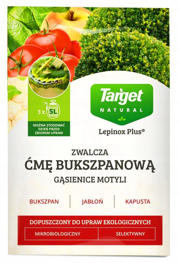 Лепінокс Плюс Таргет Натурал - препарат для боротьби з самшитовою міллю та гусеницями метеликів. Особливо рекомендований для боротьби з самшитовою міллю та для екологічного захисту рослин. Має поверхневу дію на рослину. Він містить Bacillus thuringiensis, бактерію, яка природно зустрічається на рослинах і в ґрунті.