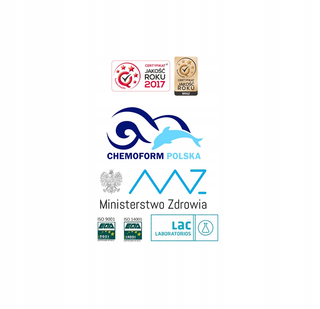 Хімікати для басейнів Chemoform AG (Німеччина)мають сертифікати ISO 9001 ISO 14001, Європейський сертифікат якості® для препаратів для очищення води та чистка та дезінфекція басейнів, сертифікати PZH та дозволи на продаж на польському ринку, видані міністром охорони здоров'я та сертифікат контролю якості. Вони виготовляються відповідно до найвищих норм і стандартів, що діють у Європейському Союзі.