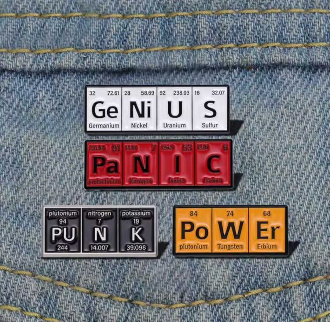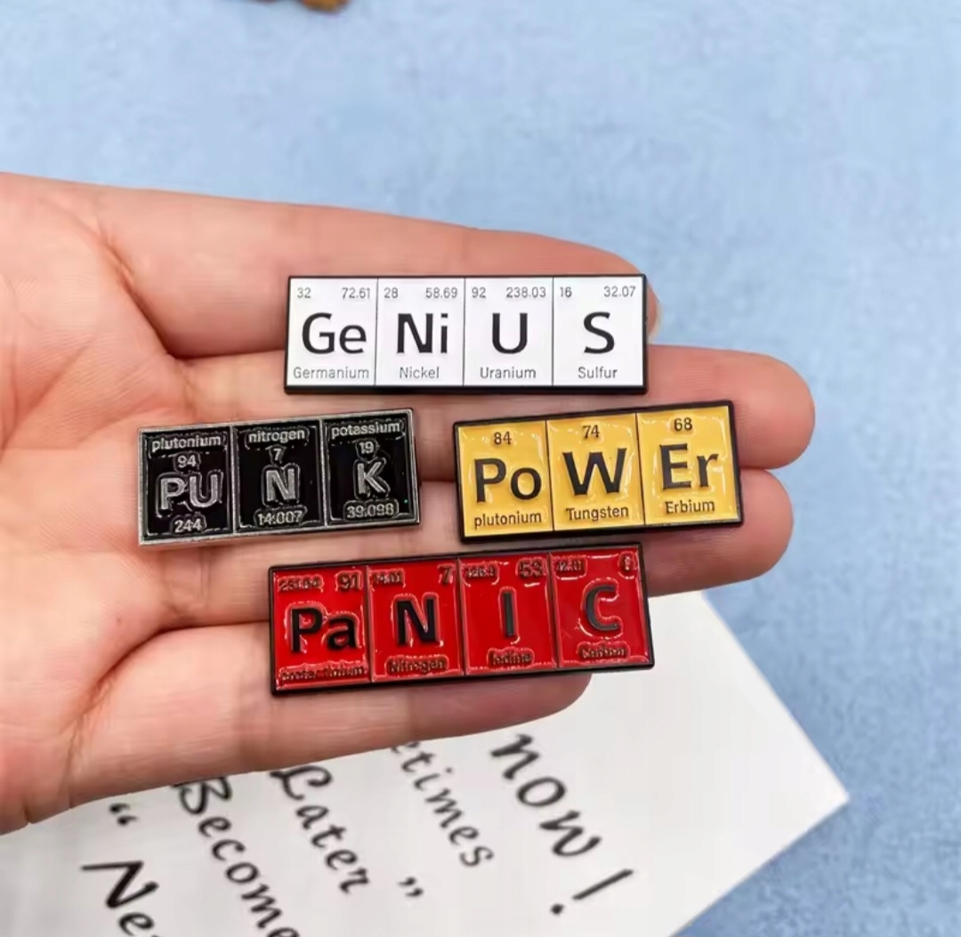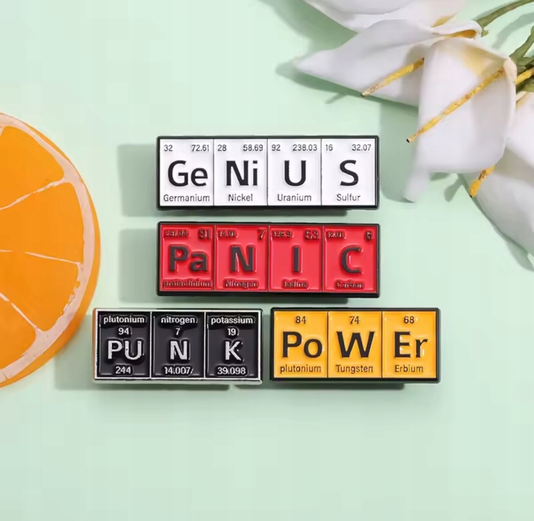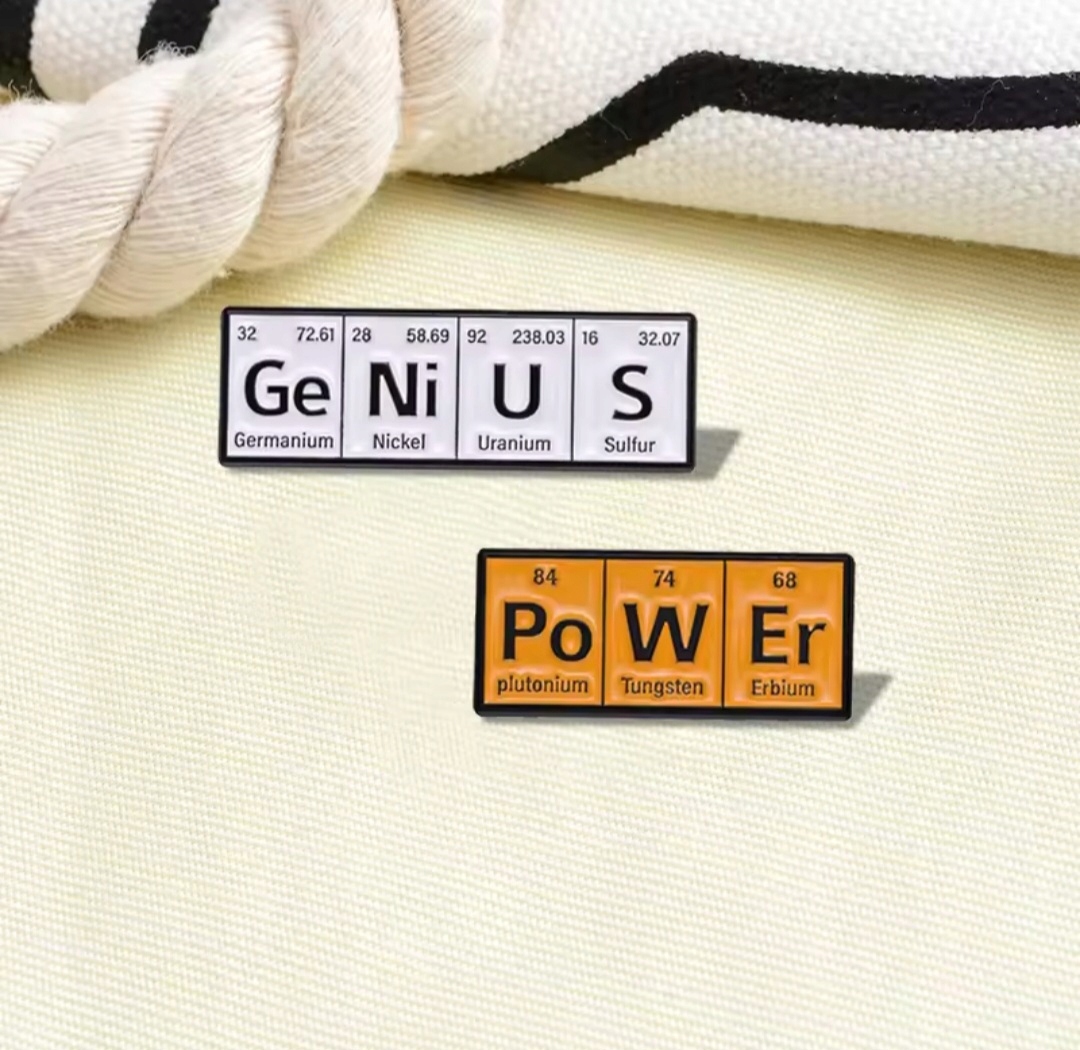 Емальована шпилька, яка дотепно використовує хімічні символи з періодичної таблиці для створення слова "ГЕНІЙ".