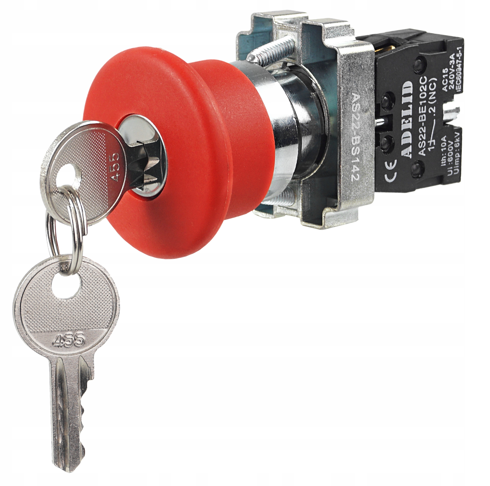 Операція: вмикається прямим натисканням грибоподібної головки, розблоковується поворотом ключа.