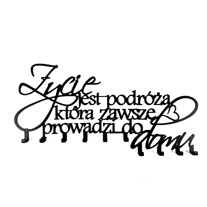ДЕКОРАТИВНА ВІШАЛКА "ЖИТТЯ - ЦЕ ПОДОРОЖ, ЩО ЗАВЖДИ ВЕДЕ ДОДОМУ" " ДОПОМОЖЕ ВАМ СТВОРИТИ АТМОСФЕРУ ЦЬОГО ОСОБЛИВОГО МІСЦЯ, ЯК ВАШ ДІМ. Неможливо? Не повністю! Про функціональну сторону моделі подбають десять гачків, а візуальний ефект полягає в оригінальному дизайні, в якому переплітаються два шрифти. Вся ця річ виготовлена з матеріалу, стійкого до інтенсивного використання - тому вішалка також добре працюватиме в місцях з великою кількістю домочадців або гостей.