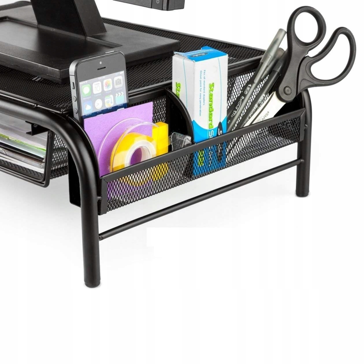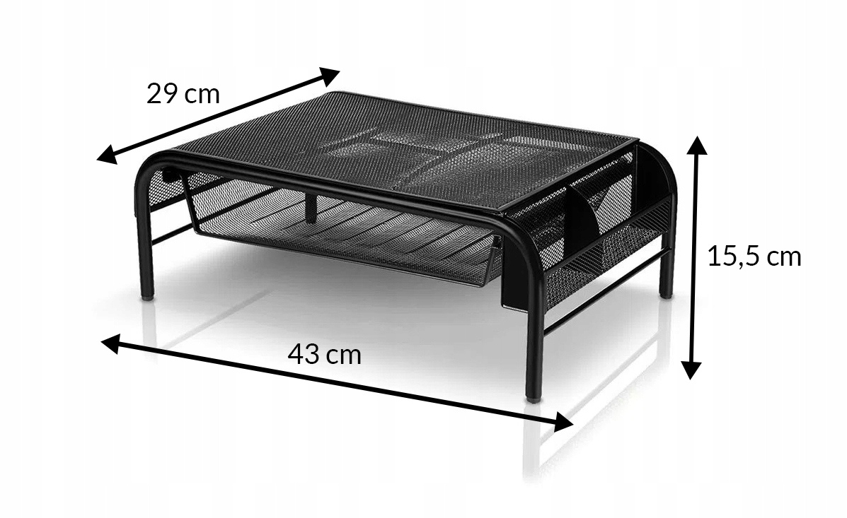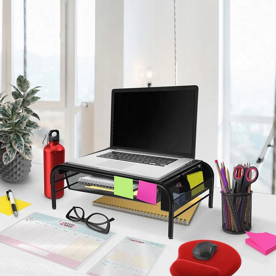 Хороша підставка, яка піднімає екран, шухляда для документів і відсік для ручок – усе це зроблено з міцної сталевої сітки, яка забезпечує циркуляцію повітря та утримує електронні пристрої круто.