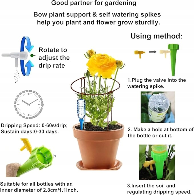 - Пакет містить: 8 х, призначений для іржі рослин, що підтримують рослини (висотою 60 см, шириною 30 см), 2 х автоматичні шипи зрошення