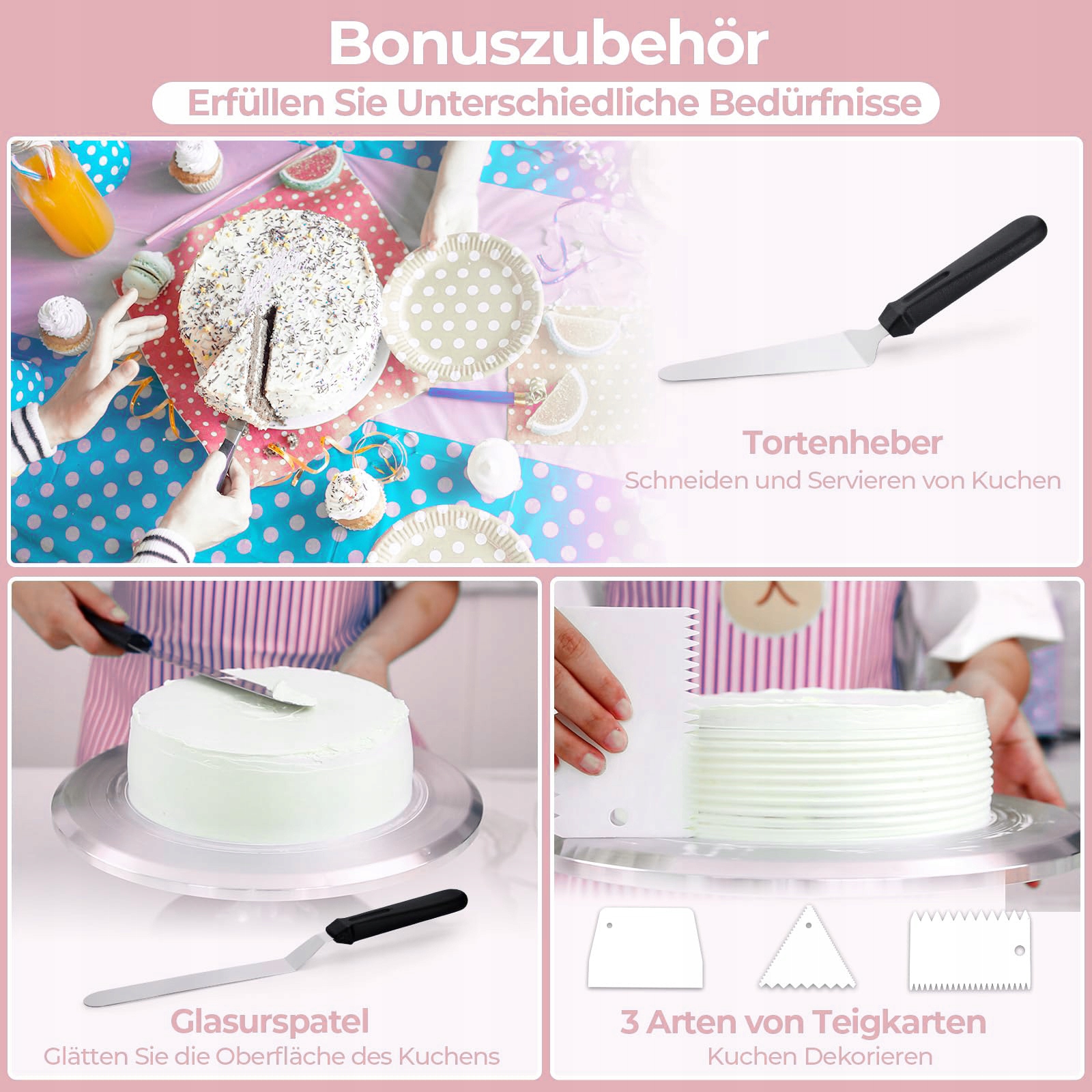 Бонусні аксесуари: обертовий набір містить 3 силіконові скребки тіста та 2 скребки з нержавіючої сталі, досить густі, щоб вирізати тісто, подати пластмаси тіста або торта, згладити краватку навіть стратифікований пиріг. Більше того, завдяки 12 різним дизайном, його можна використовувати для створення різних текстур і згладжування боків тіста - прекрасний торт знаходиться у ваших пальцях.