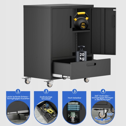 Міцні коліщатка: завдяки обертові кулькові колеса на 360°, шафа легко ковзає, навіть коли вона заповнена, і фіксується на місці.