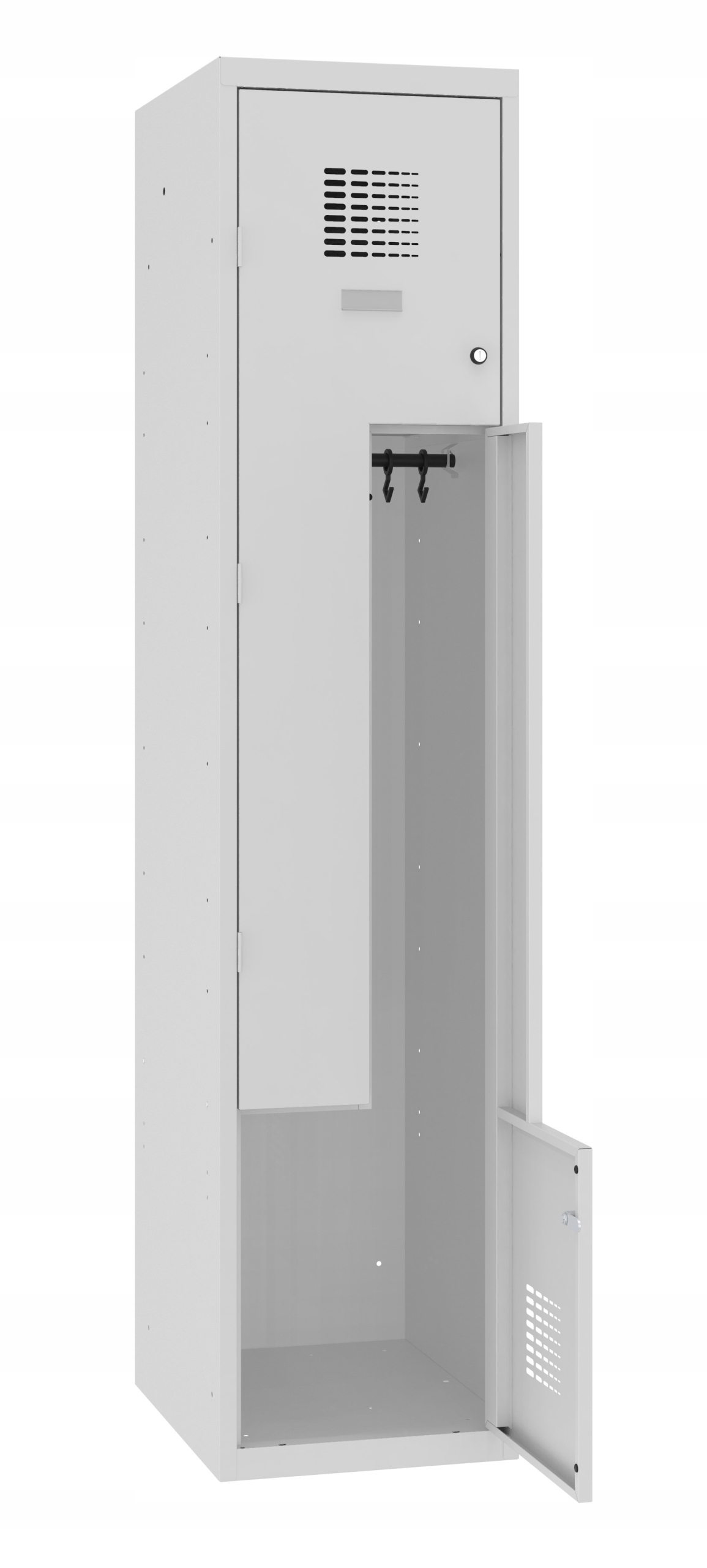 Дверцята металевої шафи СУЛ мають 2 посилення з листового металу товщиною 0,6 мм. Шафа закривається циліндровим замком із замиканням в 1-й точці. Користувачі роздягальні мають у своєму розпорядженні штангу з двома гачками. Гардеробна шафка SUL має Г-подібне відділення. Завдяки цьому ми можемо розмістити на одній поверхні вдвічі більше відділень, ніж у стандартній металевій шафі. Шафа закривається циліндровим замком.