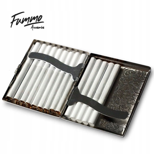 Металевий портсигар з монограмою Fummo — елегантний аксесуар для людей, які цінують стиль і функціональність. Виготовлений повністю з металу, він вражає своєю довговічністю та точністю обробки. Оснащений міцною пружинною застібкою, він гарантує комфортне використання та безпеку зберігання сигарет. Графічний мотив у вигляді хромованого гравіювання надає йому виняткової елегантності та позачасового характеру. Він може вмістити 20 сигарет – по 10 на кожній стінці, ефективно захищаючи їх від пошкоджень.