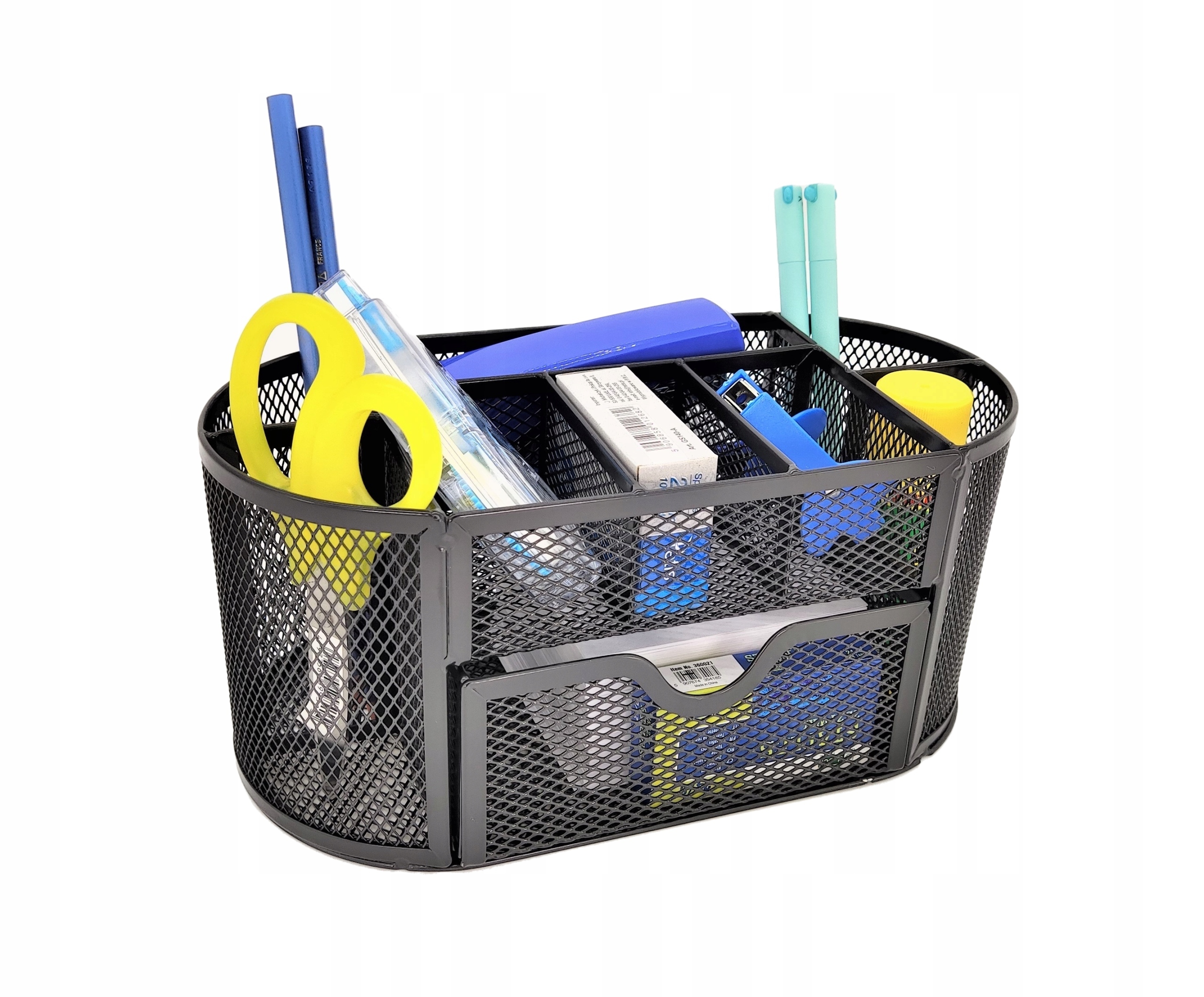 Металевий настільний органайзер для організації робочого місця. Оснащений висувною шухлядою, у якій легше ховати, наприклад, нотатки. Додатково оснащений 4 вертикальними контейнерами, наприклад, для ручок, клею тощо, і 4 меншими контейнерами для скоб, канцелярських скріпок, гумки.