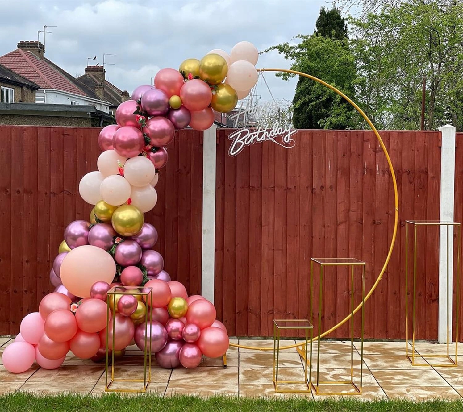 Велика, безкоштовна, круглої весільної арки. Міцний металевий каркас з важкою базовою підставкою наодинці і виготовлений з металевих деталей, які легко рухаються та поєднуються, ідеально підходять на задній та весільній церемонії. Підходить для перенесення легких рослин і лоз або як маленьких висячих акцентів прекрасного входу в сад.