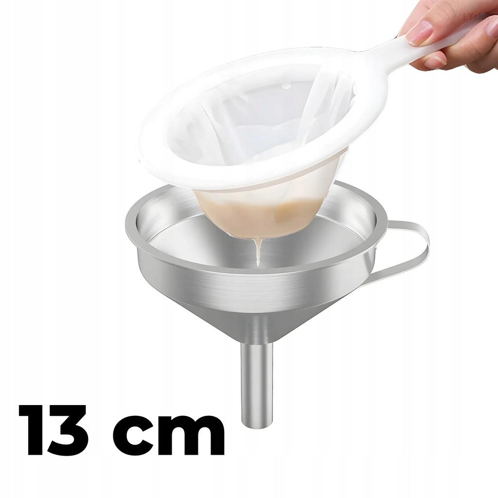 Металева воронка діаметром 13 см - це практичний кухонний інструмент з високоякісної нержавіючої сталі, який завдяки нейлоновому фільтру ефективно фільтрує рідини. Він ідеально підходить для використання на кухні та під час виробництва алкогольних напоїв та інших рідин.