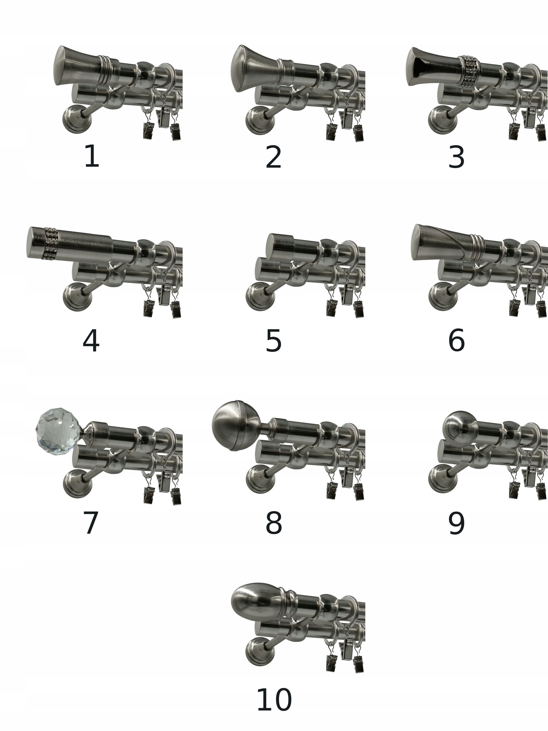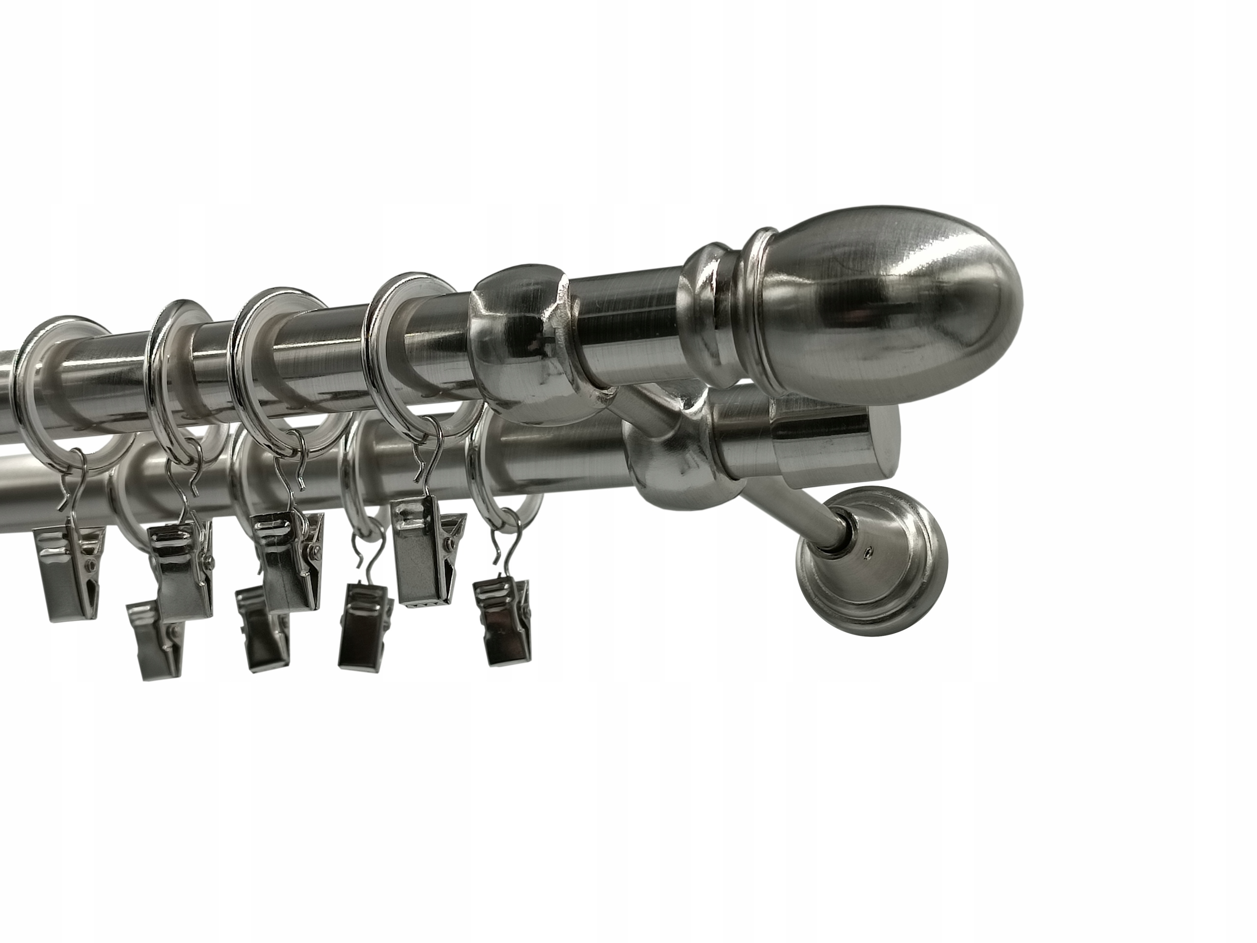 На цьому аукціоні ви купуєте подвійний металевий штор з діаметром труб Fi 19+19 мм у кольорі нікелю з довжиною 240 см із вибраним наконечником.