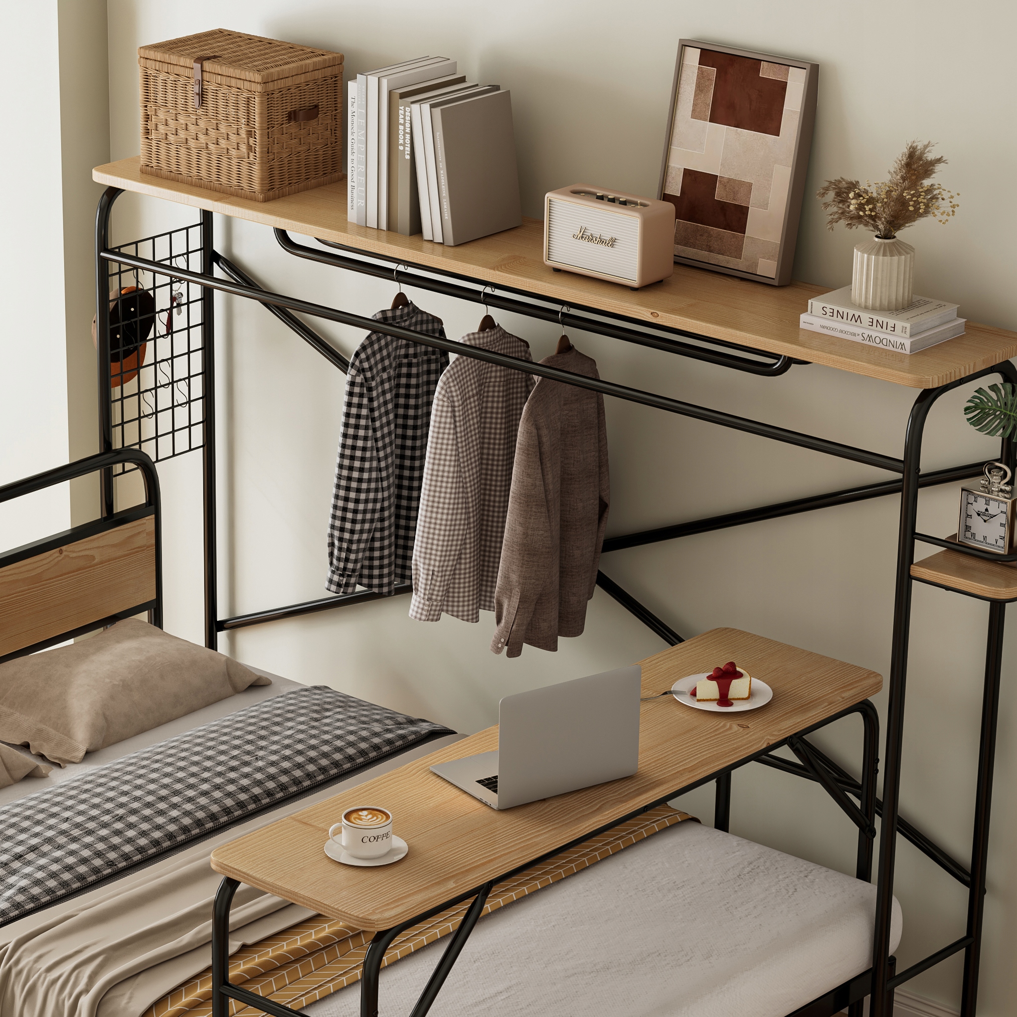 металеве ліжко, плоске ліжко + стіл + стояча вішалка, стіл на колесах, повні меблі для спальні для молоді та дорослих, металевий каркас, метал + mdf, чорний + натуральний, 140x200