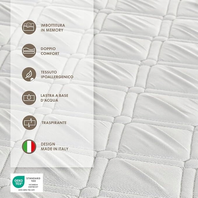 матрац для вас: Ортопедна пам’ять, має висоту 20 CM. Перший шар містить пам’ять, а другий - з водної піни, тобто виготовленої з полімерів, розширених водою, що дозволяє досягти високого ступеня вентиляції, збільшуючи дихання.