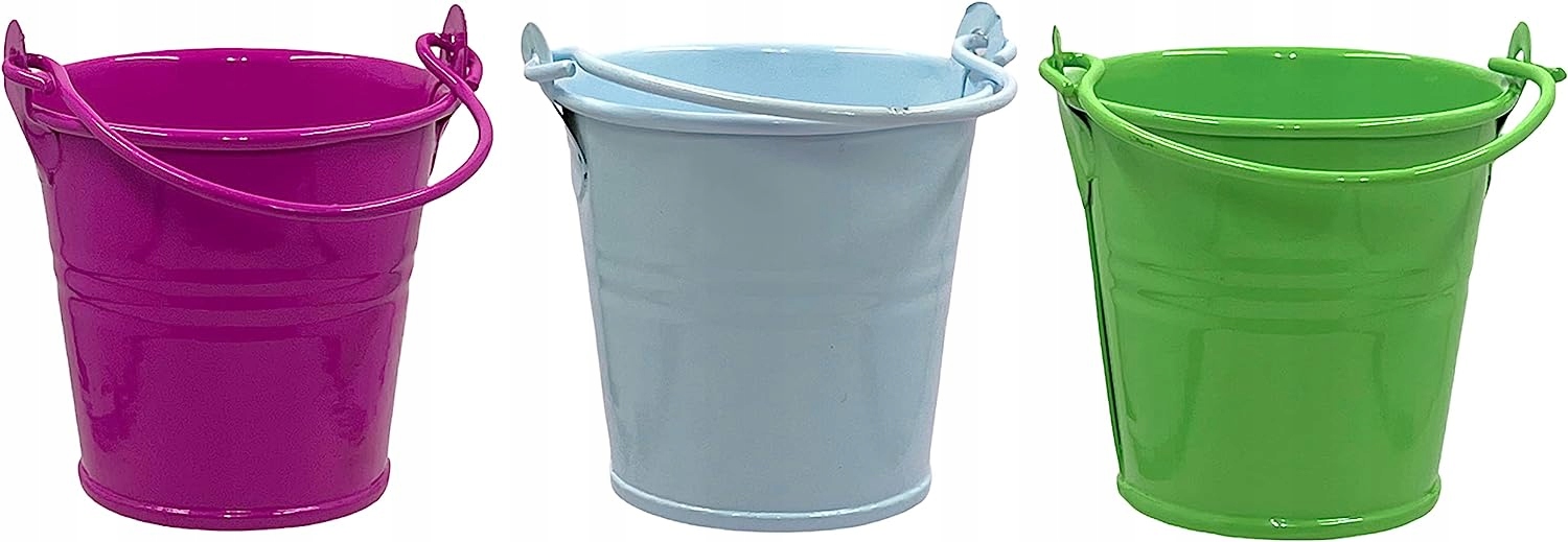 - Різнокольорові невеликі металеві кошики ідеально підходять для прикраси підвіконь і офісних столів. Завдяки маленьким ручкам міні-відерця також ідеально підходять для підвішування.
