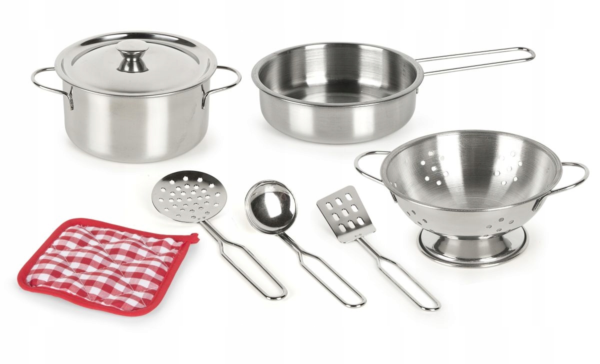 Набір каструль і аксесуарів для веселого приготування їжі.