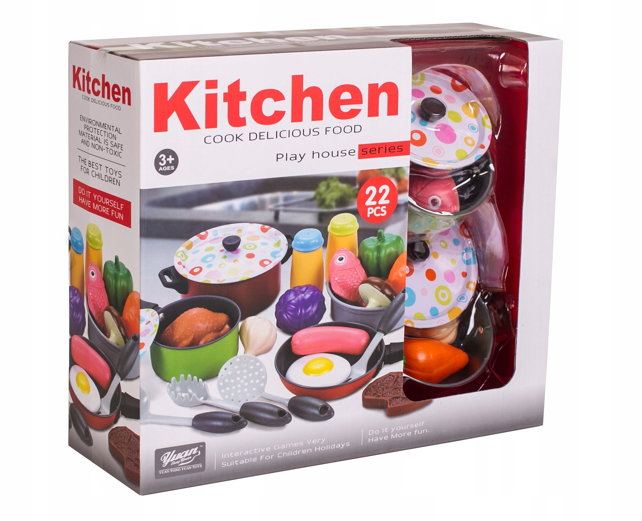 ВЕЛИКИЙ НАБІР ІГРАШКОВИХ ГОРЩИКІВ, КУХОННИХ ПРИНАДЛЕЖНОСТЕЙ ТА ПРОДУКТІВ ХАРЧУВАННЯ