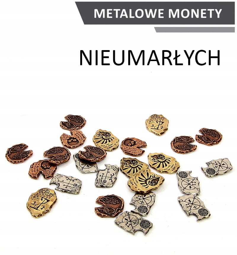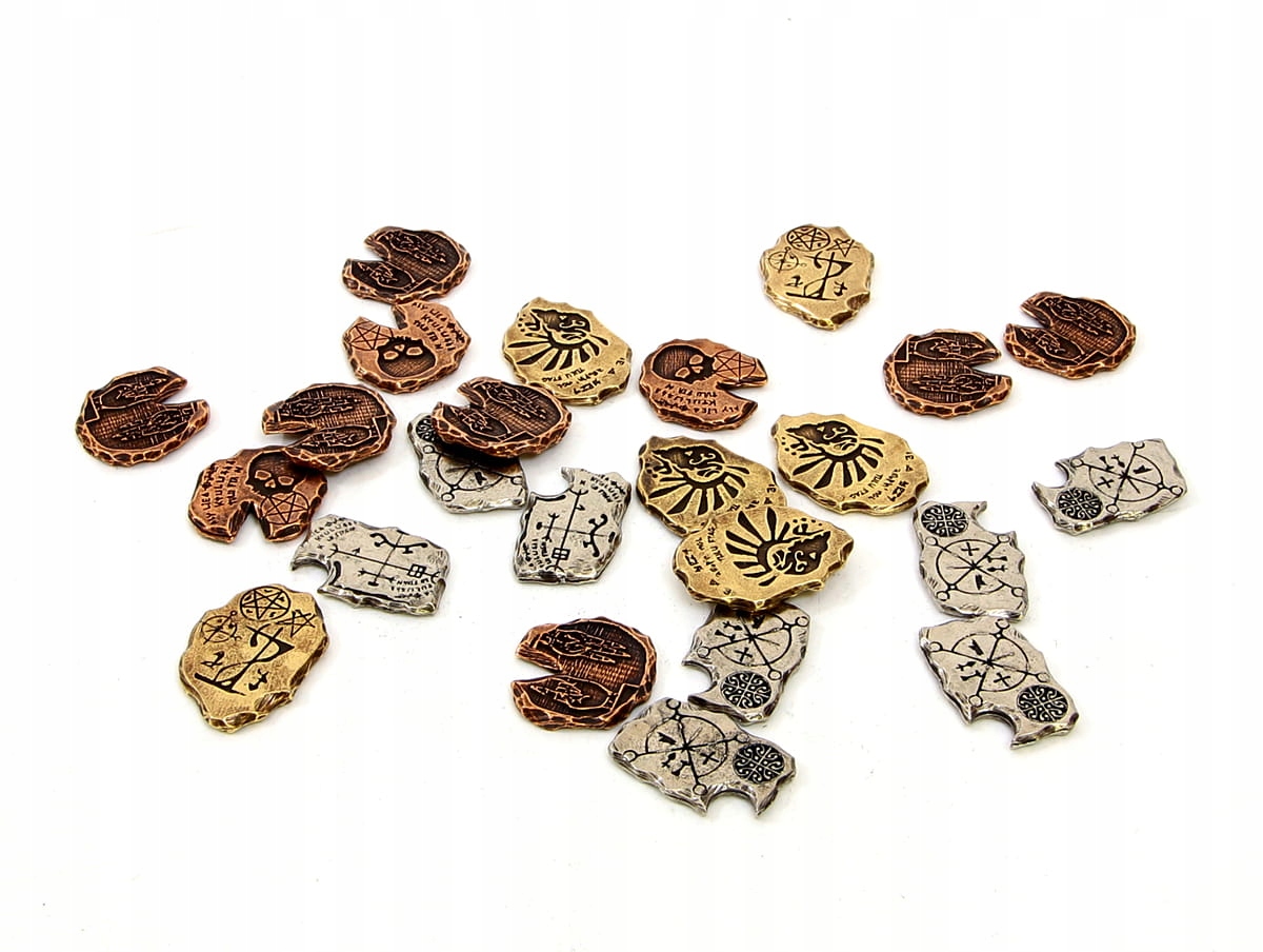 Зроблені з цинкових сплавів, набір з 20 масивних, точно прикрашених монет, які демонструють мотиви, пов'язані зі смертю та окультизмом.