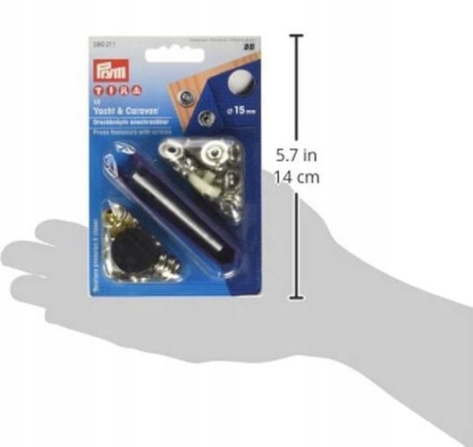 Застібки "Yacht & Caravan" - металеві застібки для самостійного кріплення, диам. 15 мм, срібло. Латунь, нержавіюча сталь, стійка до корозії. У набір входить 10 комплектів фіксаторів, нижня частина яких кріпиться гвинтом до міцної основи з дерева або подібних матеріалів, а верхня частина (з головкою шпильки) може постукати молотком або за допомогою цвяхозабивні машини. У набір входить пристосування, що полегшує їх штифтування молотком, і наконечники для заливного пістолета або штатива. Завдяки способу кріплення їх використовують у човновому та туристичному спорядженні (пристібні брезенти тощо) або в меблевій промисловості (подушки, покривала чи матраци, прикріплені до меблів, які легко знімаються для прання).