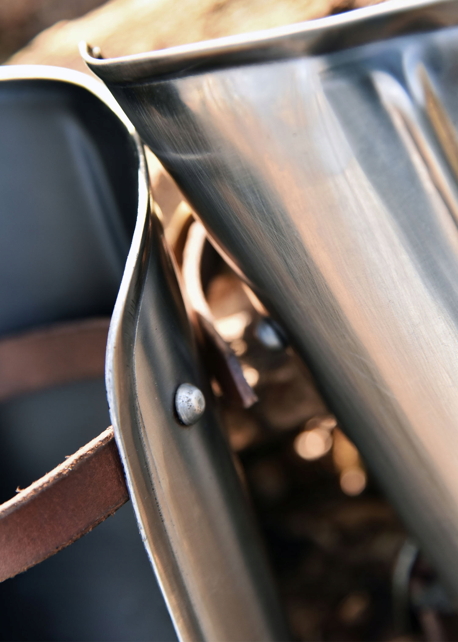 Броня для передпліччя ручної роботи. Завдяки відповідному профілюванню та загнутим краям вони виконують свою функцію, навіть якщо використовується сталь товщиною лише 1,2 мм.