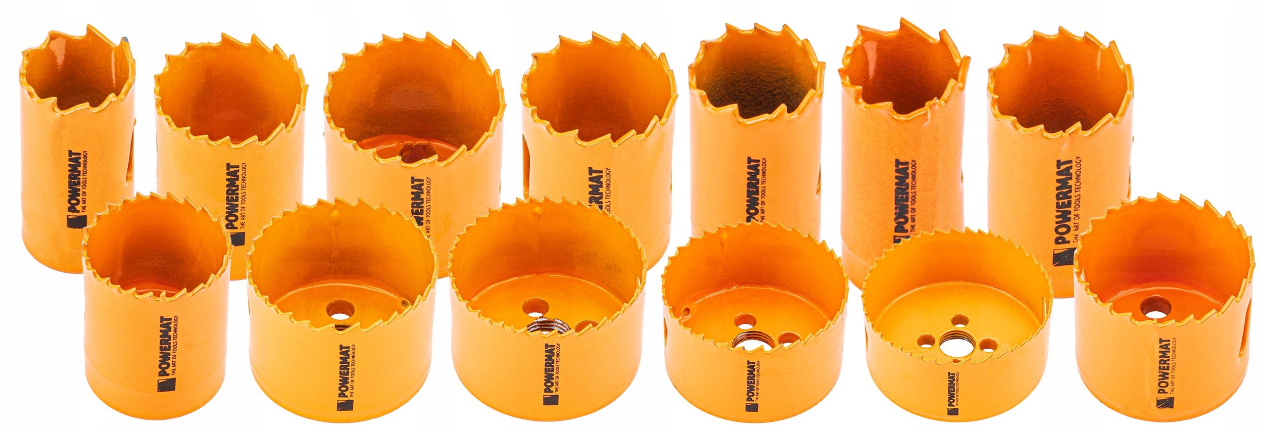 отвори Powermat, виготовлені з HSS сталі, гарантія довговічності, гнучкості та стійкості до високих температур. Набір з 17 отворів (19–76 мм) з шестикутними адаптерами буде працювати під час різання металу, деревини та пластмас. Міцні зуби забезпечують довге життя, а суцільна валіза полегшує перевезення.