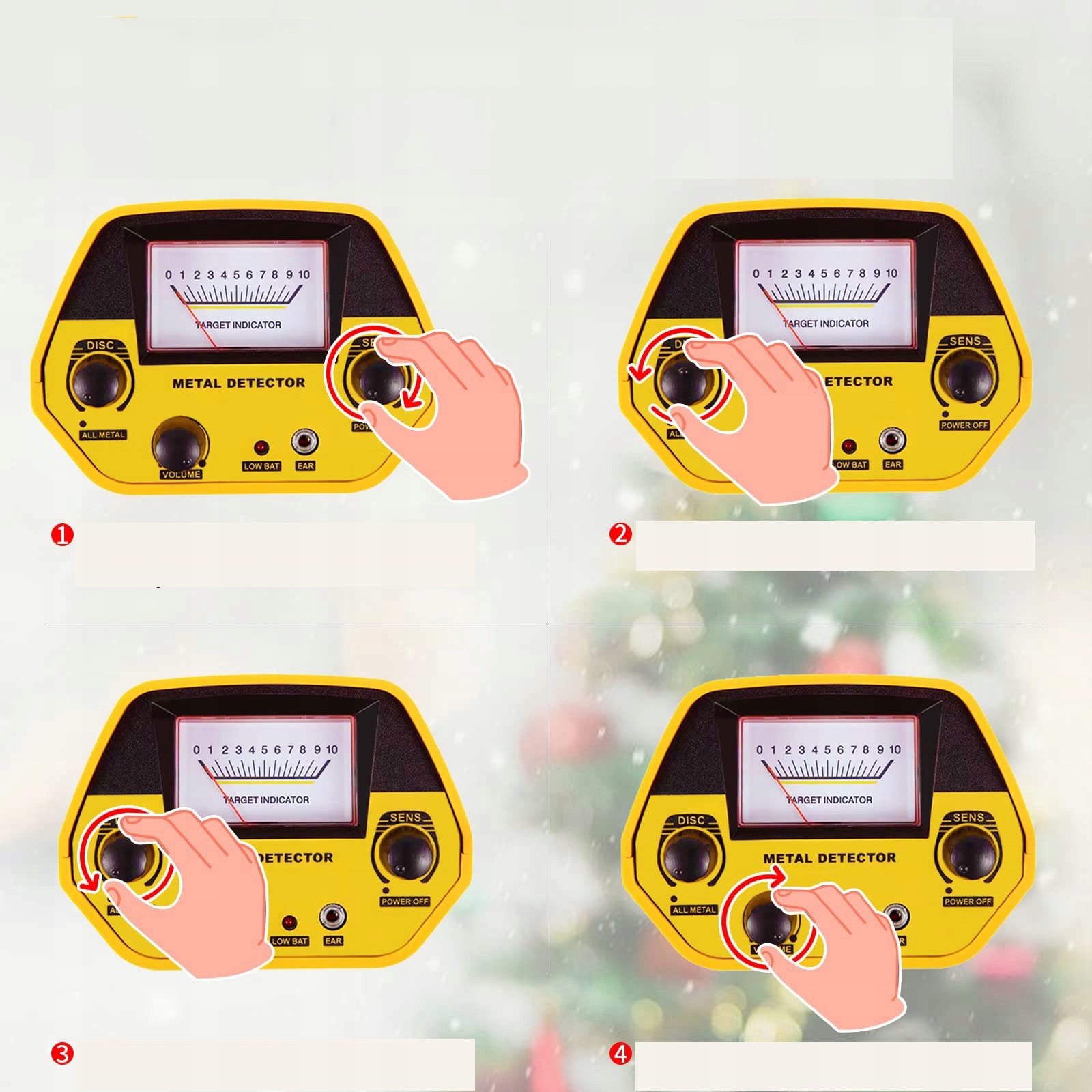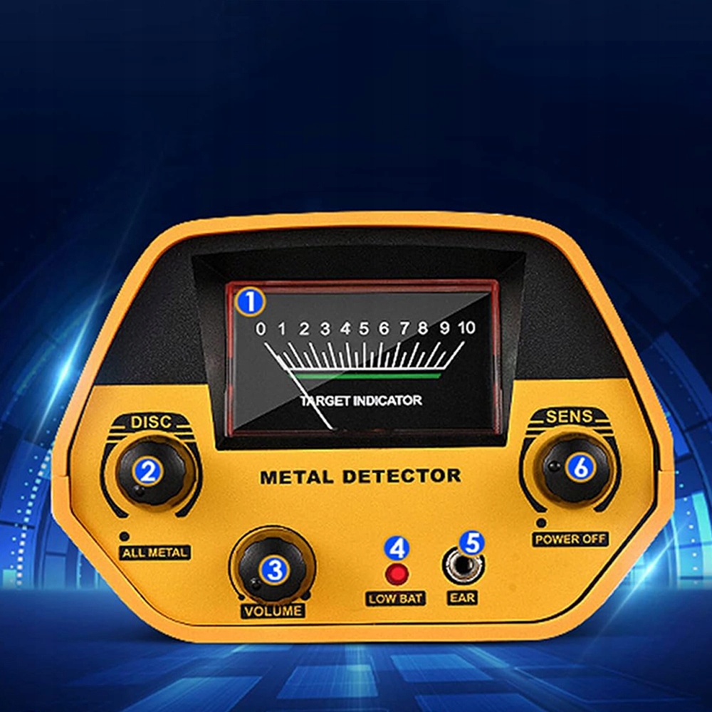 Поверніть перемикач всупереч руху настанов у положенні "вимкнення", щоб вимкнути пристрій. Увімкніть перемикач відповідно до руху за годинниковою стрілкою, щоб увімкнути пристрій. Металевий детектор оснащений екраном індикатора, щоб легко побачити режим виявлення, рівень чутливості та стан акумулятора. Якщо метал буде знайдено, голка лічильника буде рухатися вправо.