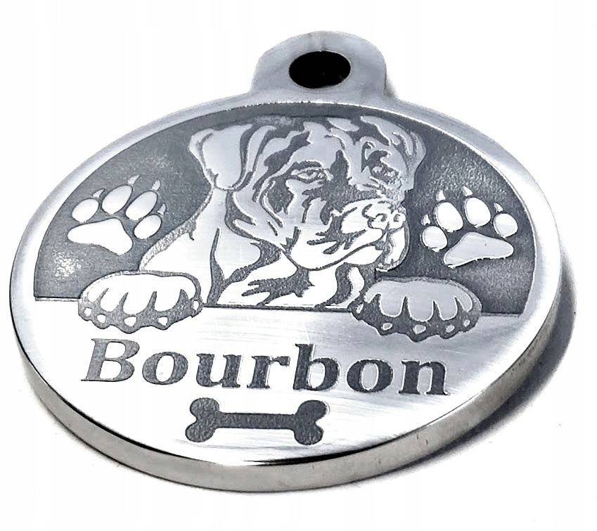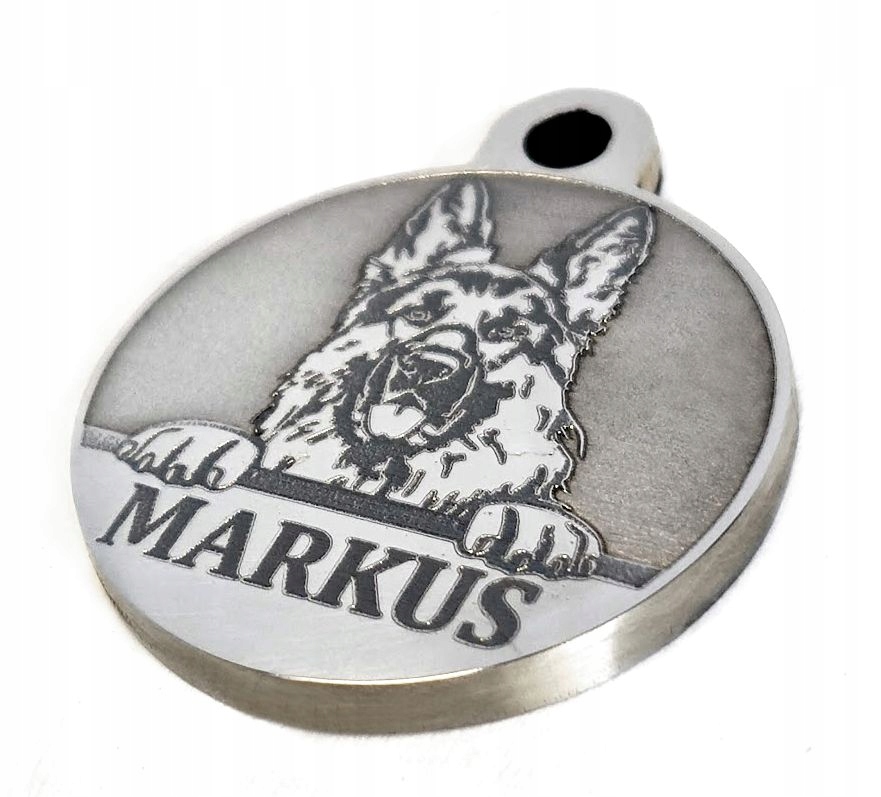 Гравірування виконується з обох сторін із зображенням собаки з іменем на передній частині та адресою та номером телефону на звороті.