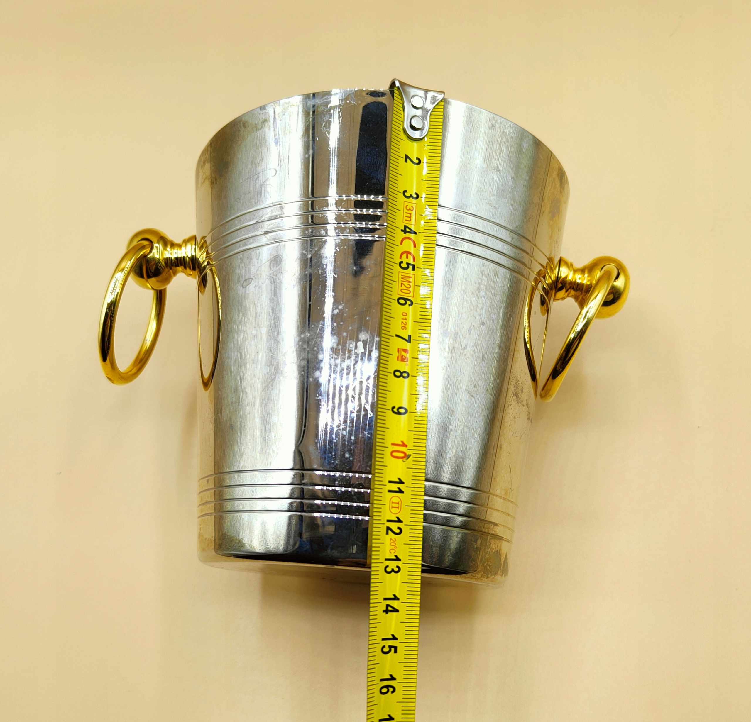 контейнер, виготовлений з нержавіючого відполірованого металу. Латунні ручки. Висота 13 см, ширина, виміряна руками 17,5 см, верхній діаметр 13 см, нижній діаметр 9,5 см, вага 0,5 кг. Ємність 1,2 л. Це давній вінтажний предмет і вже багато років, ви, мабуть, можете його відшліфувати настільки, що він буде світити, як дзеркало;). Це добре виглядає і зараз чарівно. Live виглядає так само гік, як на знімках. Рекомендую!