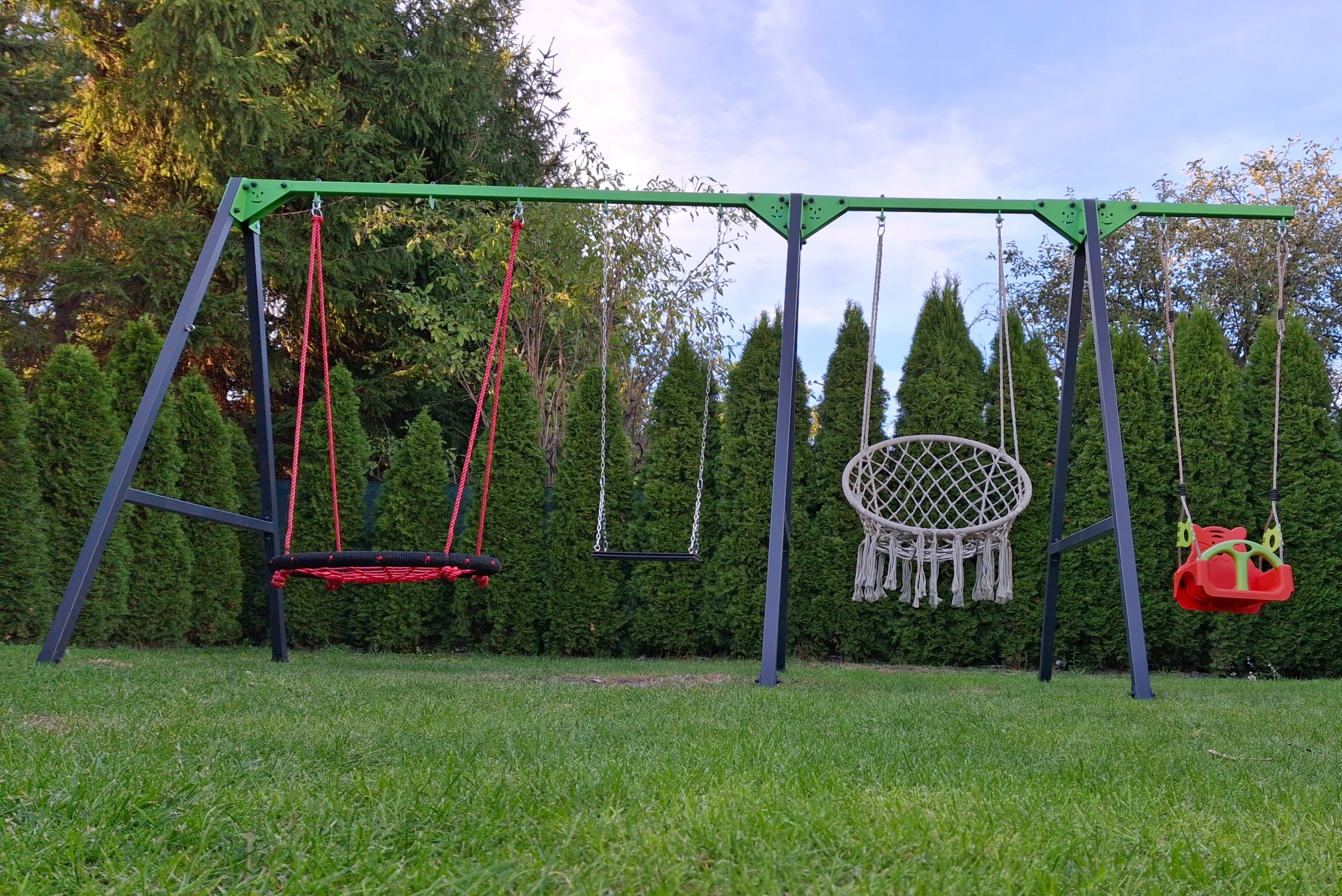 Садовий гойдалки, дитячий майданчик без з'єднань, тобто ніг і верхня перехрестя виготовлені з рівномірних елементів (не торкаються посередині). Клієнт отримує не стандартний пакет 2,5 м.