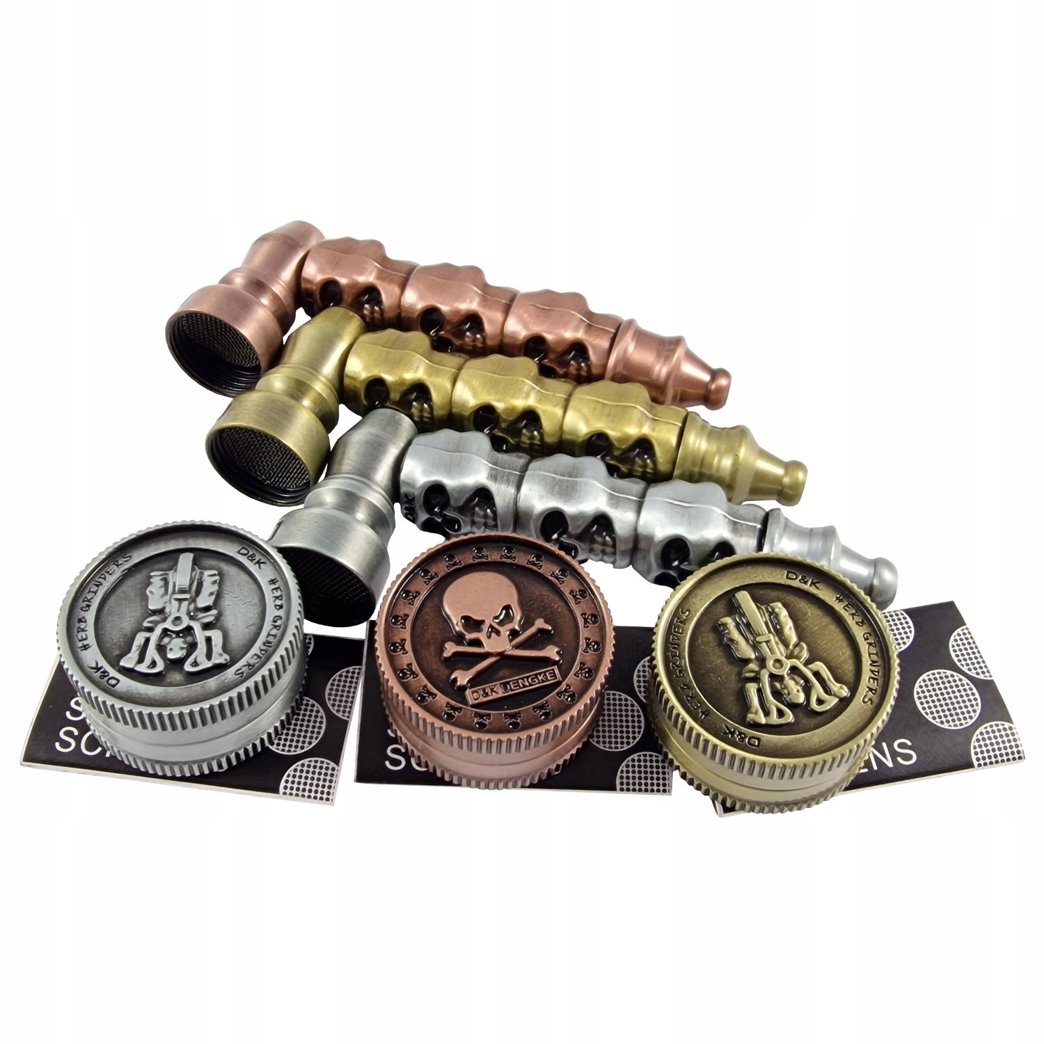 Невеликий зручний набір, що містить металеву бочку з малюнком черепа та маленьку металеву шліфувальну машину з двох частин. Стовбур легко відкручується, що полегшує очищення.