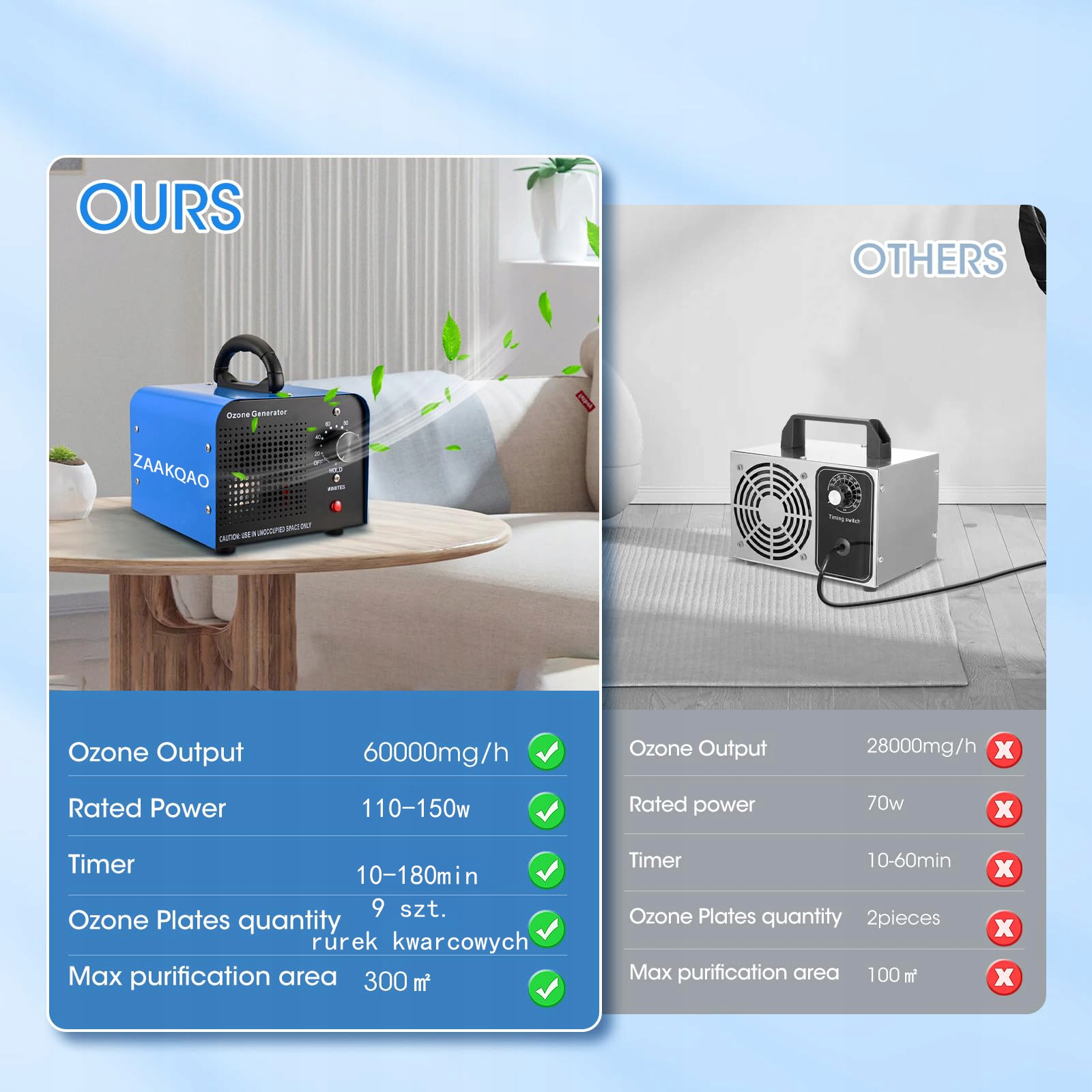 ✅ Більше потужності - генератор має максимальну вихідну потужність 60000 мг/год, що підходить для простору 300㎡. Виробництво озону більш стабільне, ефективність на 50% вища, ніж у звичайної озонової машини.