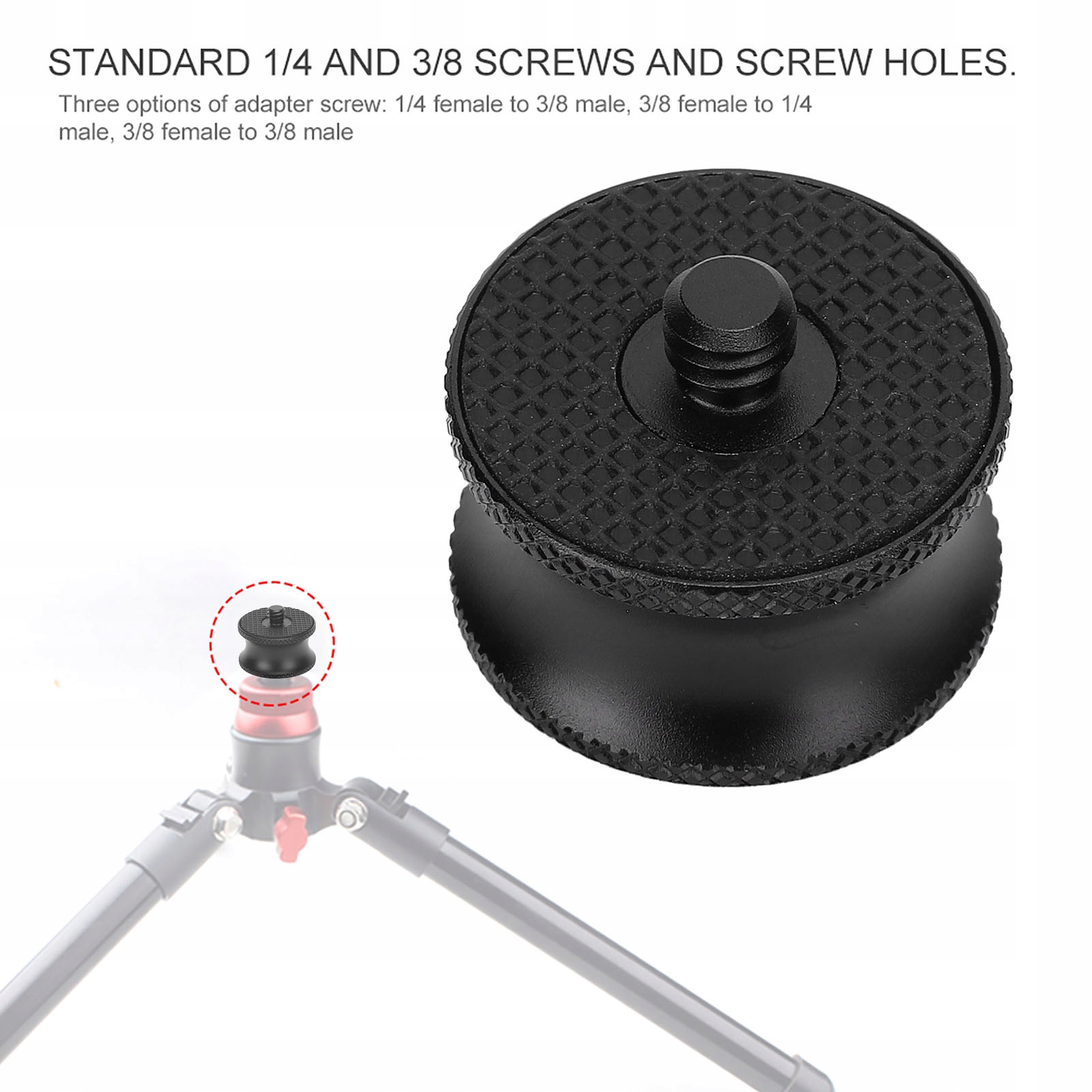 3. Стандартні гвинти 1/4 дюйма та 3/8 дюйма та отвори для гвинтів. Три варіанти перехідних гвинтів: 1/4 дюйма мама на 3/8 дюйма вирізка, 3/8 дюйма внутрішня на 1/4 дюйма вирізняна, 3/8 дюйма внутрішня на 3/8 дюйма вилка.