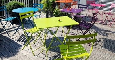 Розсувні столи з лінії Bistro. Класика французького дизайну, патент зареєстрований у 1889 році. Складані столи Bistro – флагманський продукт французького бренду, виготовлений зі сталі, кілька шарів металевого покриття гарантують стійкість до погодних умов, таких як мороз, УФ-промені чи волога.
