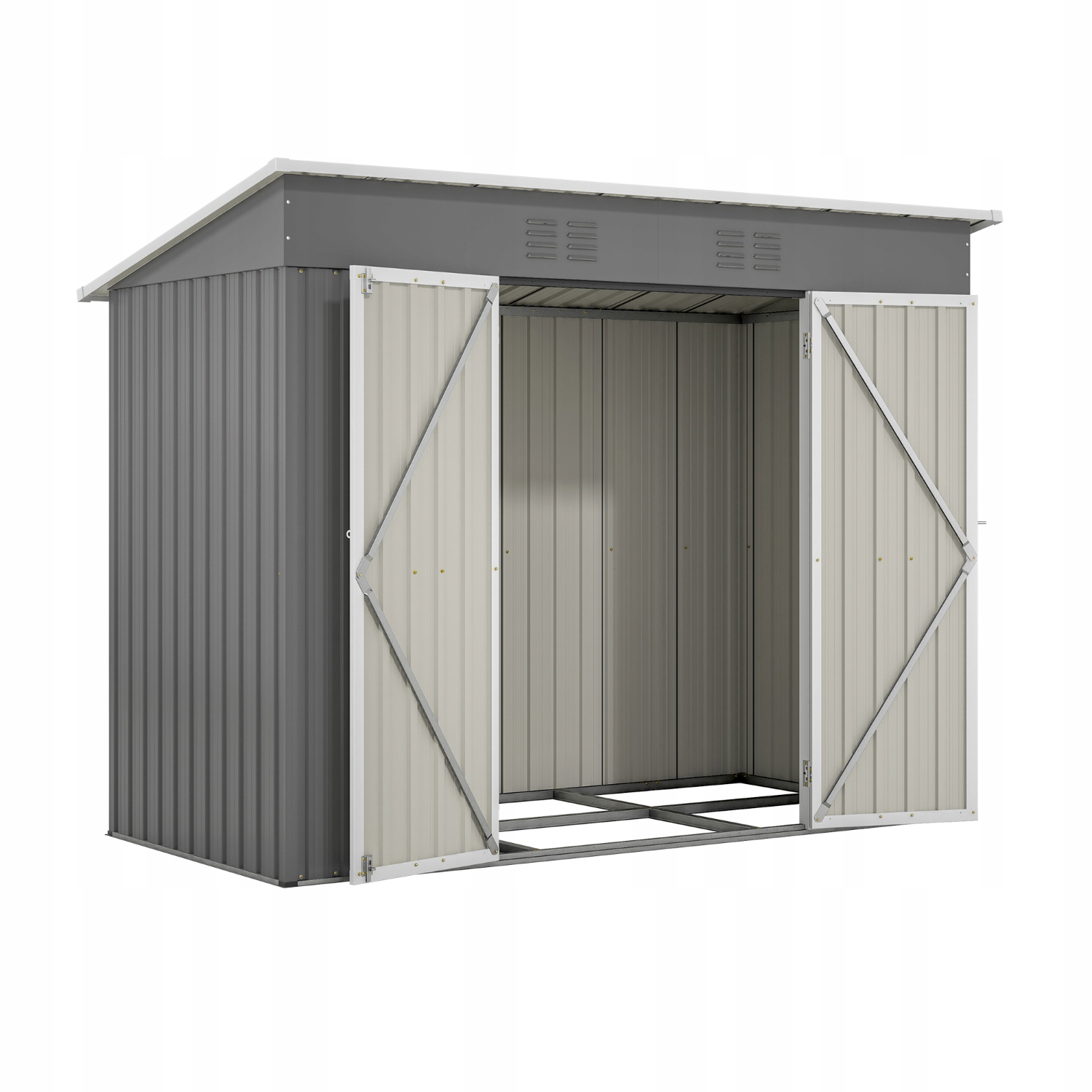 Сарай для інструментів виготовлено з високоякісного оцинкованого листового металу, який є водонепроникним, стійким до іржі та ультрафіолетового випромінювання, забезпечуючи надійний захист за будь-яких погодних умов.